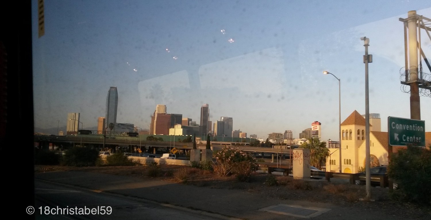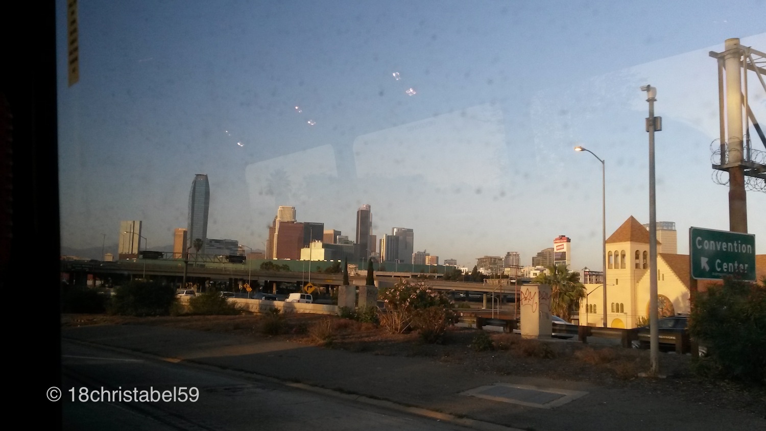 Und dann ging’s ganz schnell. Keine 5 Minuten später standen wir vor dem Terminal an der Bushaltestelle für den Flyaway-Bus (ne Art Busexpress) in die Stadt. Wir mussten etwas warten, aber dann kam DER Entertainerbusfahrer schlecht hin. Der Typ stieg aus dem Bus – kleiner Schulbus für 20 Mann – und rief mit einem lauten Organ „Hollywood? Hollywood!“. Total freundlich schwang er unsere Kindertrolleys ins Heck dieses Klapperbuses und fuhr dann wie der Henker los, um noch andere Terminals vom Flughafen anzugrasen und von dort Leute einzusammeln. LAX hat 7 Terminals… Am letzten hat er uns abkassiert und es folgte eine Einweisung in den Bus, dass er 5 Notausgänge hat (2 vorn, 2 hinten, 1 oben) und dass die Fahrt eine gute Stunde dauert. Und schwups bretterte der Typ mit dem Klapperbus über die Autobahn nach Hollywood, zwischenzeitlich mit starken Erschütterungen (er nannte es „etwas holprig“), dass die Gepäckarmaturen über unseren Köpfen wie Kuhschwänze wackelten.