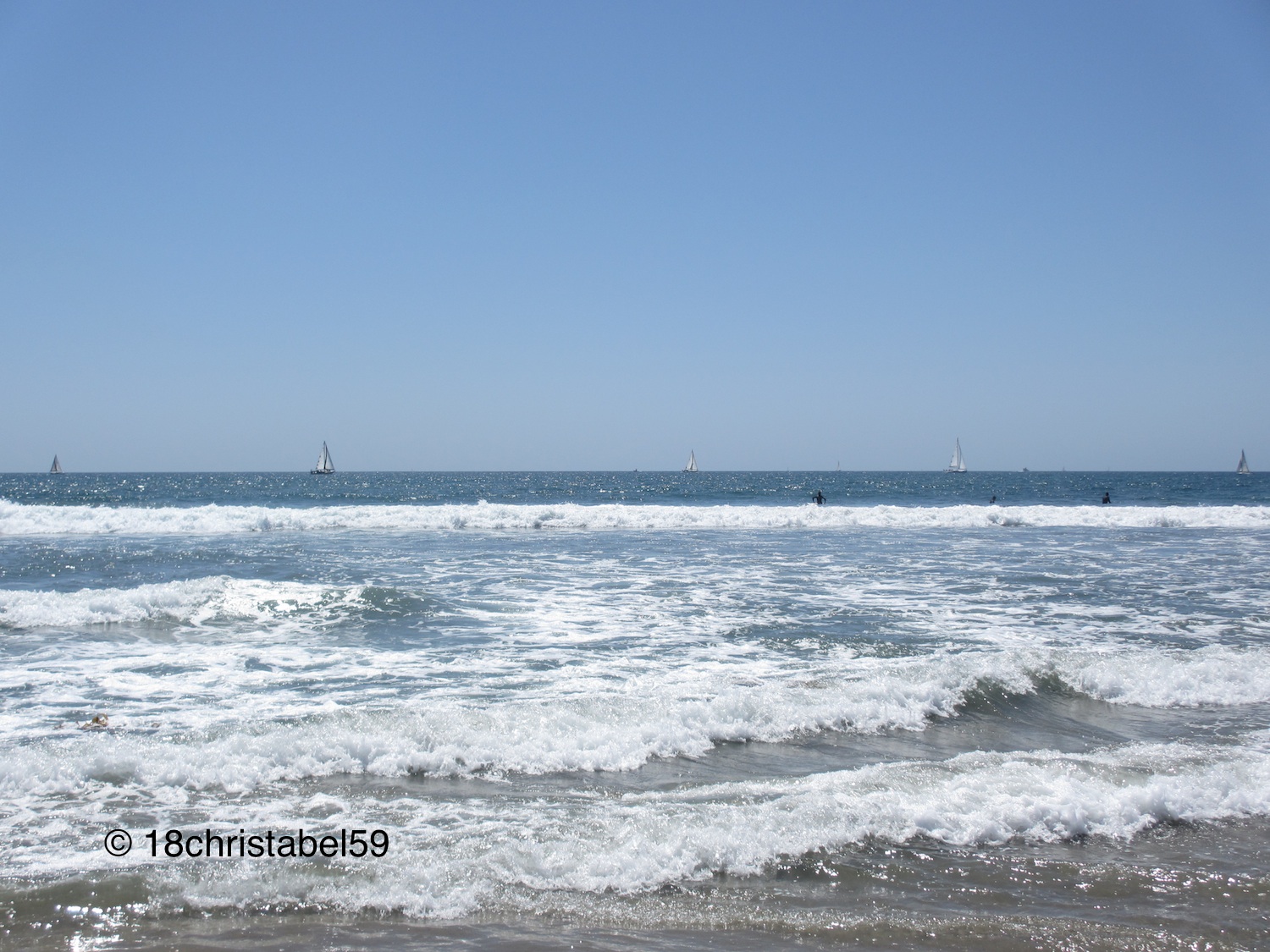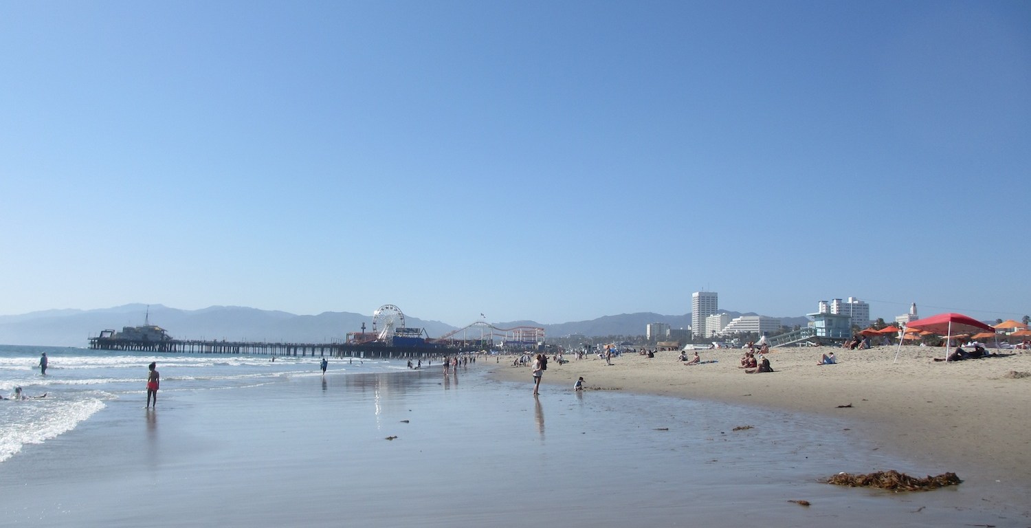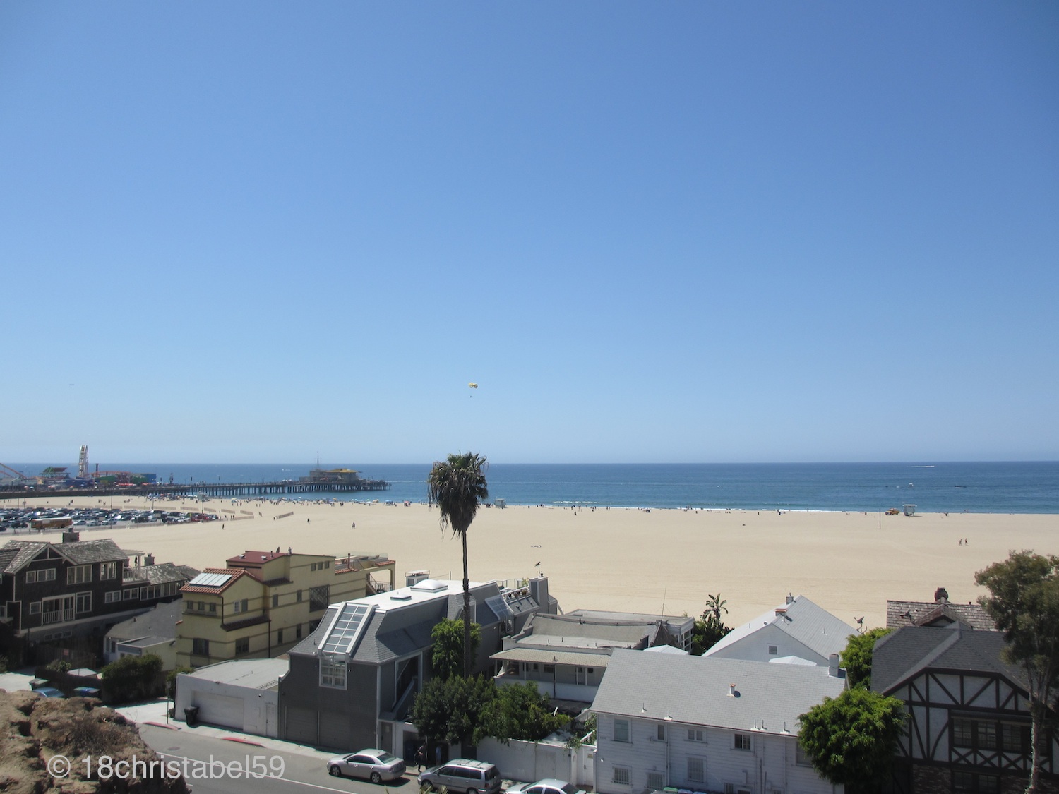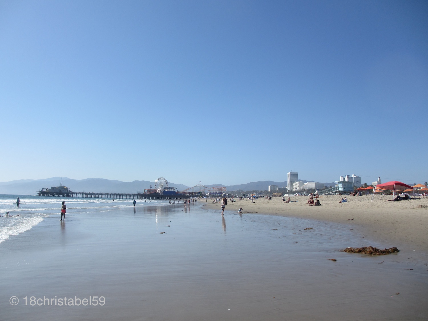 Also wenn man schon in der Stadt der Engel ist, dann musst man sich auch mal den Strand da ansehen. Das haben wir uns auch gedacht und wir sind schön ne Stunde mit dem Bus nach Santa Monica gefahren. Kaum ausgestiegen, waren wir von Touristen umringt, aber vor uns lag der Pazifik, im strahlenden Sonnenschein mit hellgelben Sandstrand, kleinen Häuschen, den Türmen der Rettungsschwimmer und natürlich dem berühmt berüchtigten Santa Monica Pier. Oberhalb des Strandes, am Ocean Drive tümmelt sich ein Hotel nach dem anderen, dazwischen diverse Restaurants. In den Seitenstraßen und Blocks dahinter gibt’s noch Shops und Cafés und weitere Läden.