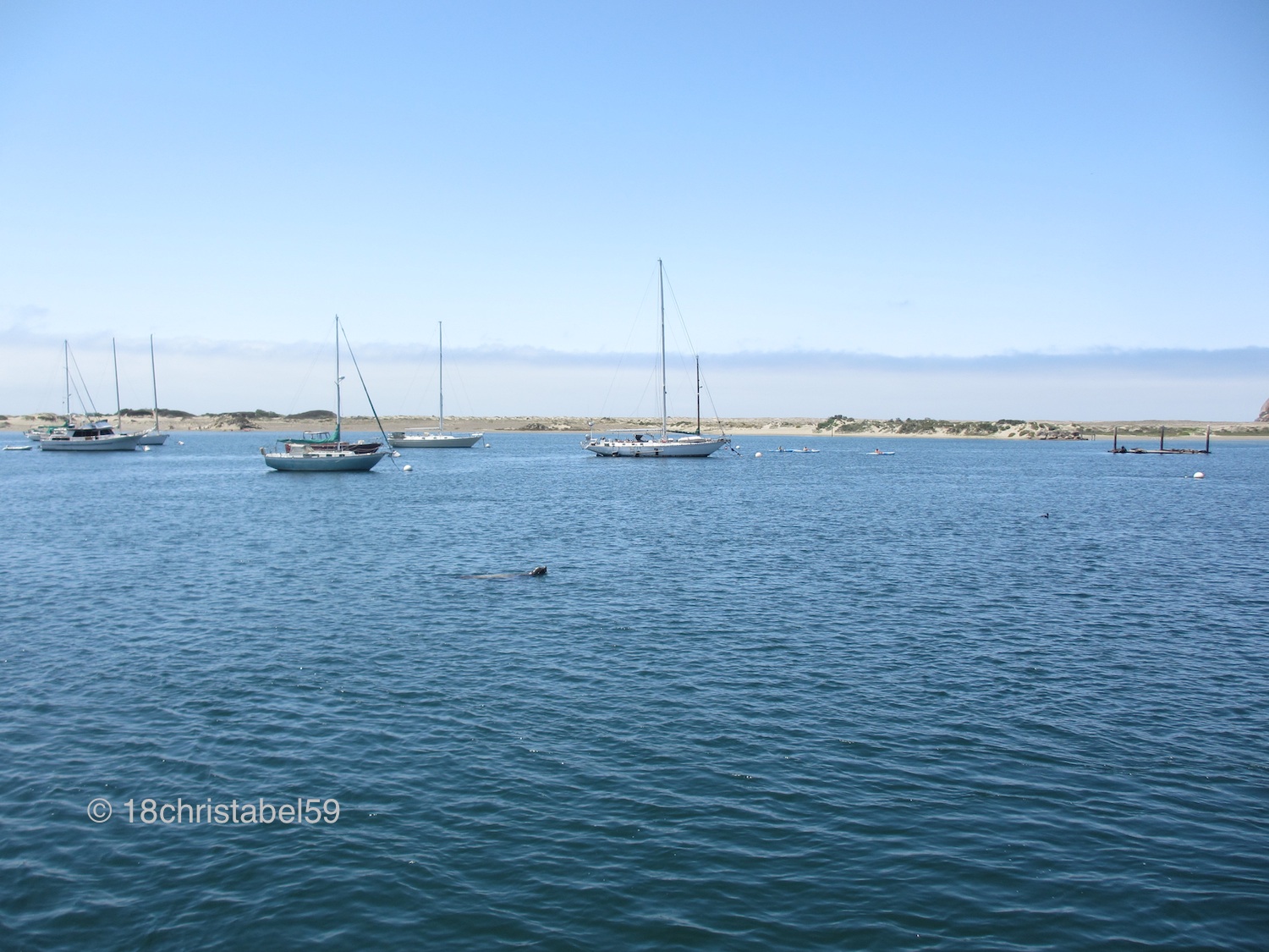 Nach einem kräftigen Frühstück mit Pancakes, Bacon, Würstchen und Rührei bei Denny’s ging’s weiter den Highway 1 nach Norden. Unser erster Zwischenstoß war Morro Bay, ein kleines, verschlafenes Fischernest mit einem riesigen Felsen in der Bucht. An der überschaulichen, kleinen Promenade mit bunten Holzhäusern gab es allerlei, was das Touri-Herz begehrte: Ab- und Anlegestellen zum Walegucken, kleine Strandläden, Cafés, Restaurants und Kneipen, alle mit einer Terrasse zum Meer und dem kleinen Hafen mit Fischkuttern und zum Morro Bay Felsen. Um den gibt’s noch eine sandige Landzunge herum, von wo aus die Surfer, Kayakfahrer oder Strandfanatiker starten. Als wir am Hafen Fotos vom Felsen gemacht haben, schnaufte es plötzlich unterm Pier auf und ein paar Seelöwen zogen keine 3 m unter uns ihre Runden durchs dunkeltürkisblaue Wasser. Andere beteten auf einer kleinen Insel etwas weiter weg schon die Sonne an, dicht aneinander gedrängt, immer mal wieder laut bellend. Im Hafenbecken haben wir über den Kuttern nicht nur Möwen schreien gehört und segeln sehen, sondern auch Fischotter zwischen den Booten entspannt baden sehen. Ich hab noch nie Seelöwen so entspannt in freier Wildbahn gesehen, das war echt ein Highlight für mich. Aber es sollte an dem Tag noch besser werden.