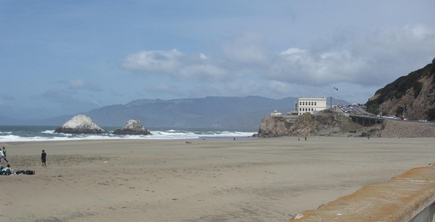 Hinter dem Cliff House gibt’s noch ein Diner und ein Visitor Center für das Naturschutzgebiet des Golden Gates. Man kann noch die Klippen runter laufen, wo die verrottenden Ruinen eines alten Jahrmarkts, der früher um 1900 mal zum Cliff House gehörte. Das sah übrigens auch mal schicker aus, aber wurde bei einem Erdbeben 1907 zerstört und dann ham die halt den Klotz dahin gebaut. Trotzdem sehr coole Lage. Hinterm Cliff House kann man noch weiter in die Golden Gate Bucht schauen und man sieht sogar die Spitze vom Nordturm der Golden Gate Bridge. Der Wind zerwühlt einem die Haare, zieht an der Jacke und lässt Seevögel in der Luft treiben. Und unter einem an den Klippen rauscht das Meer mit seinen großen Wellen. Einfach super! Ich könnte da ewig stehen und dem Meer zuhören.