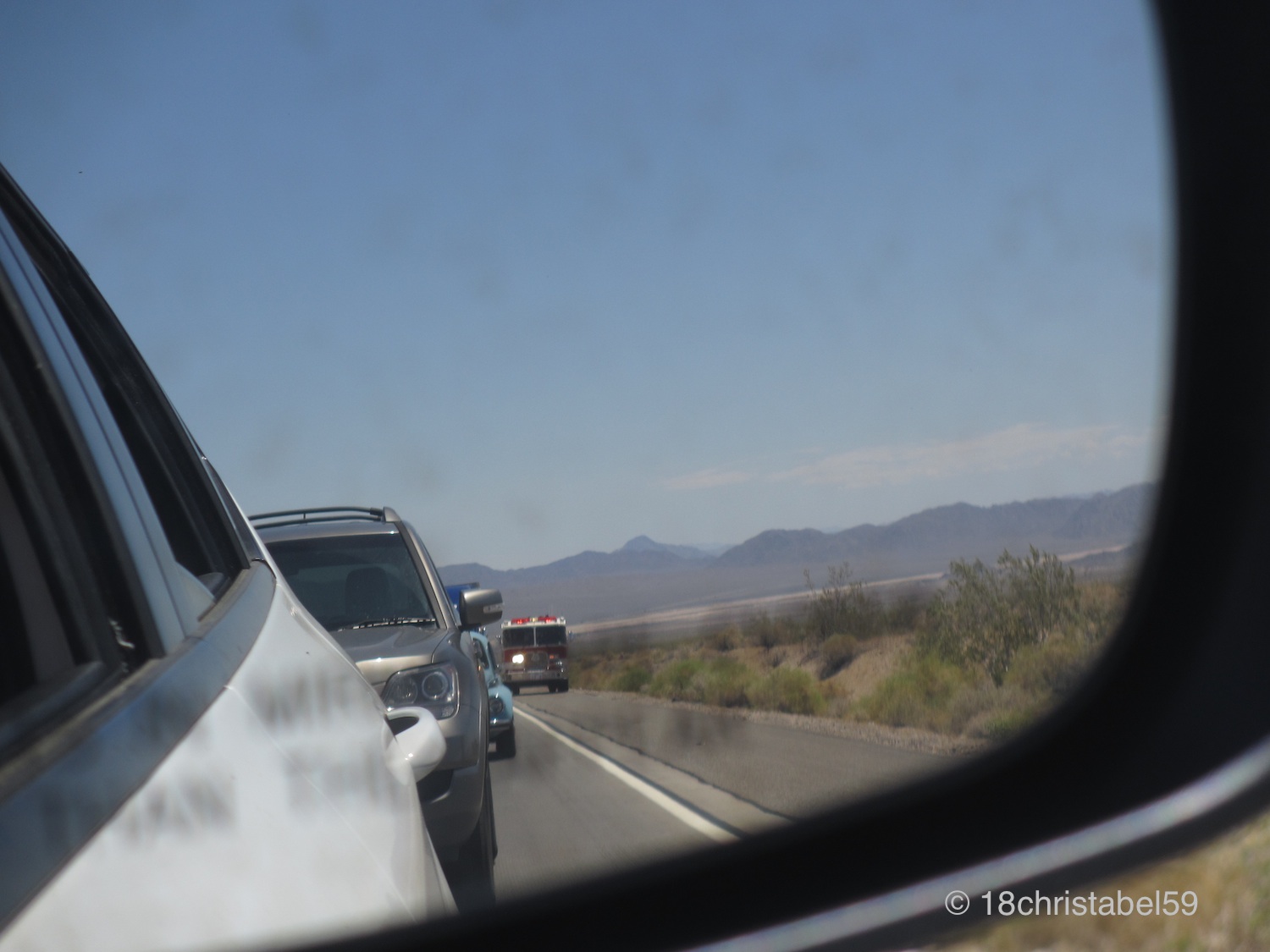 Auf halber Strecke gab’s nen Stau wegen einem Unfall auf zwei Fahrbahnen. Mitten in der Mojavewüste sind wir zu Deftones‘ „Shove It“ bei gefühlten 49°C, echten 90° Fahrenheit Hitze über den Highway gerollt. Kein Wind, außer man rollt langsam weiter. Und der is auch nur wieder n Lüftchen. Ein Highlight: ein Auto mit drei Jungs, die bei heruntergelassenen Fenstern mit gerappt ham und in jedem Fenster hing ein duftbäumchen. Die Einzigen, die uns überholt ham, waren fette Jeeps auf dem Standstreifen oder Motorradfahrer. Der kleine Haken am Stau in den Staaten: Es gibt keine Ausfahrt, keinen Parkplatz, keine Raststätte. Nur Wüste und Hitze. Yeah.