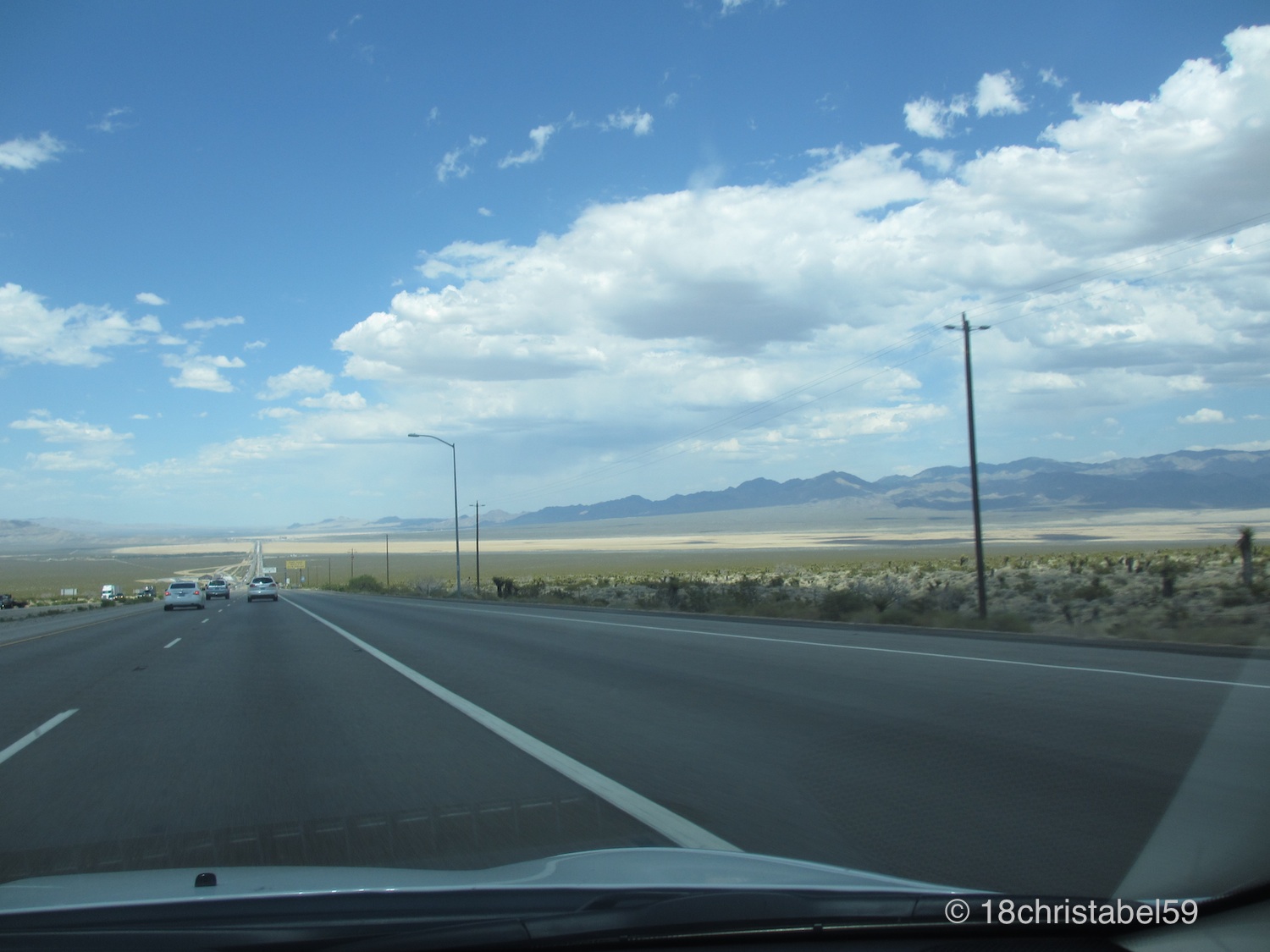 Nach eineinhalb Stunden ging’s dann endlich weiter und die Mojave Wüste zeigte sich uns in ihrer vollen Pracht. Ein Teppich aus weißem Sand, umrahmt von dunklen oder rotbraunen kargen, spitzen Bergen, am Rand der Autobahn Gestrüpp und seltsame kakteen mit klobürstenartigem blätterwuchs. Oder so kleine Palmen.