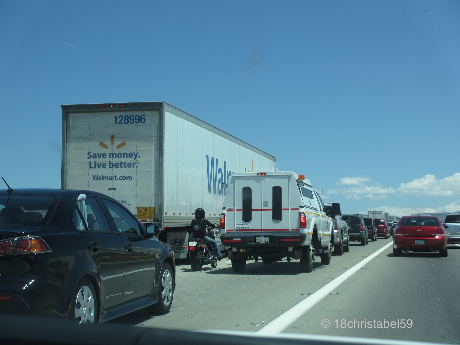 Das Unterhaltungsprogramm im Stau kann so aussehen: einen Radiosender finden (es sind nur 4, Sieger Highway Rock), Radio aufdrehen, mitrocken, Reiseführer lesen, bloggen, Fotos machen, in Autos der anderen Mitstauroller gucken, Leute beobachten, die rechts anhalten, um evtl pinkeln zu gehen, trinken und schwitzen und Pipi anhalten, weil als Frau in der Wüste nich gut pinkeln is bei dem dürren Gestrüpp und den Schlangen und Skorpionen und Eidechsen.. eine Frau vor uns hat sich trotzdem getraut. In Badeschlappen. Eine andre hat direkt auf den Seitenstreifen gepinkelt mit Sichtschutz durch Tür und davor gehaltene Jacke. Ach, und gemeisam leiden und jammern. Alle 30 min gabs ne Stau- und Wetteransage mit der einzigen Info: „Heavy delays und up to 100 degrees Fahrenheit…“(dt. „Starke Verkehrsbehinderungen und bis zu über 40 °C…“)