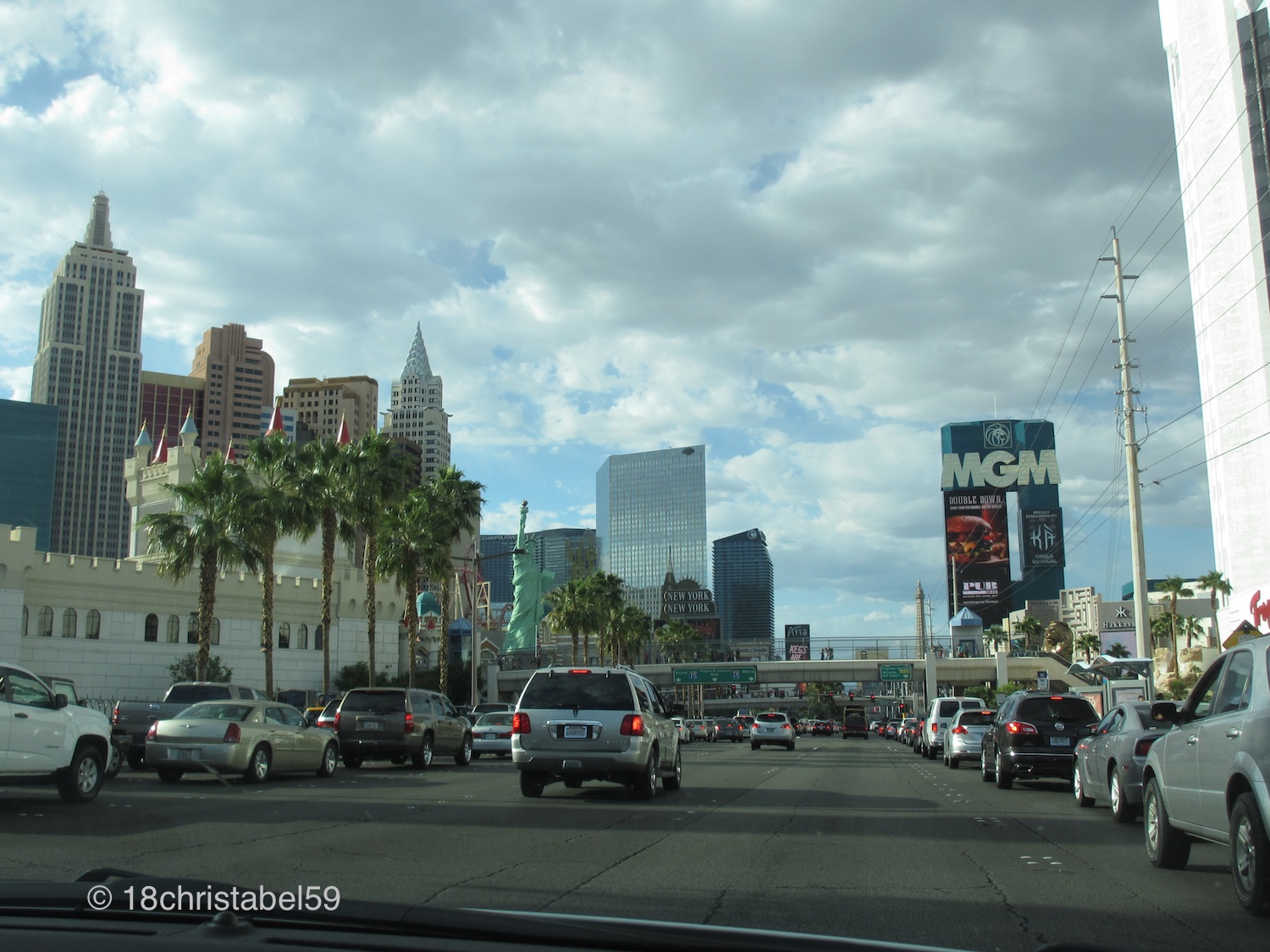 Danach ging’s zurück nach Las Vegas und schön mit Einfahrt über dem Strip. Leute, es is echt der hammer, wie sich dieser große Spielplatz für Erwachsene aufbaut. Riesige Hotelkomplexe, sogar in Gold, aufwendig verziert, mit großen Gärten, Seen und mega Leuchtreklame. Ihr kennt vielleicht die Fotos oder Bilder oder Filme, aber in echt is es einfach nur bombastisch und unglaublich. Wie im Freizeitpark und man kommt aus dem Staunen nich mehr raus. Dank Stau und roter Welle blieb viel zeit zum Gucken und Glotzen und Fotografieren.
