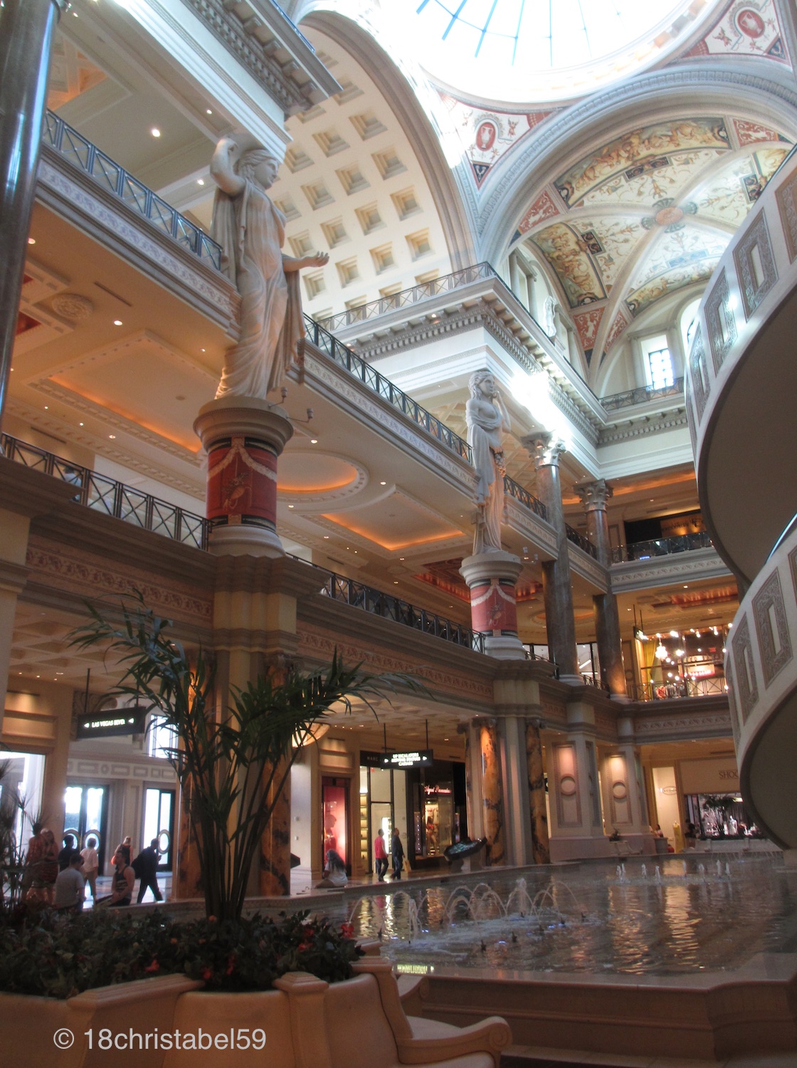 Danach sind wir durch die Malls vom Caesar Caesar und dem Venetian / Palazzo. Die heißen The Forum Shops bzw. The Grande Canal Shops. Und hier sammeln sich wie im Bellagio oder im Aria alle Designer, die man so kennt, plus noch andere kleine Läden bzw. Galerien, Souvenirshops. Das Krasse ist aber der Prunk, mit dem die das hier alles ausgestattet haben! In den Forum Shops gibt’s nicht nur eine runde Rolltreppe in einem mit gläsern überdachten Atrium, vorbei an Riesenstatuen (voll unrömisch, aber voll amerikanisch), sondern auch wie typisch italienische Gassen wie in Trastevere oder im alten Rom. Dazwischen pompöse Brunnenanlagen und oben wieder der beleuchtete blaue Dämmerungshimmel.