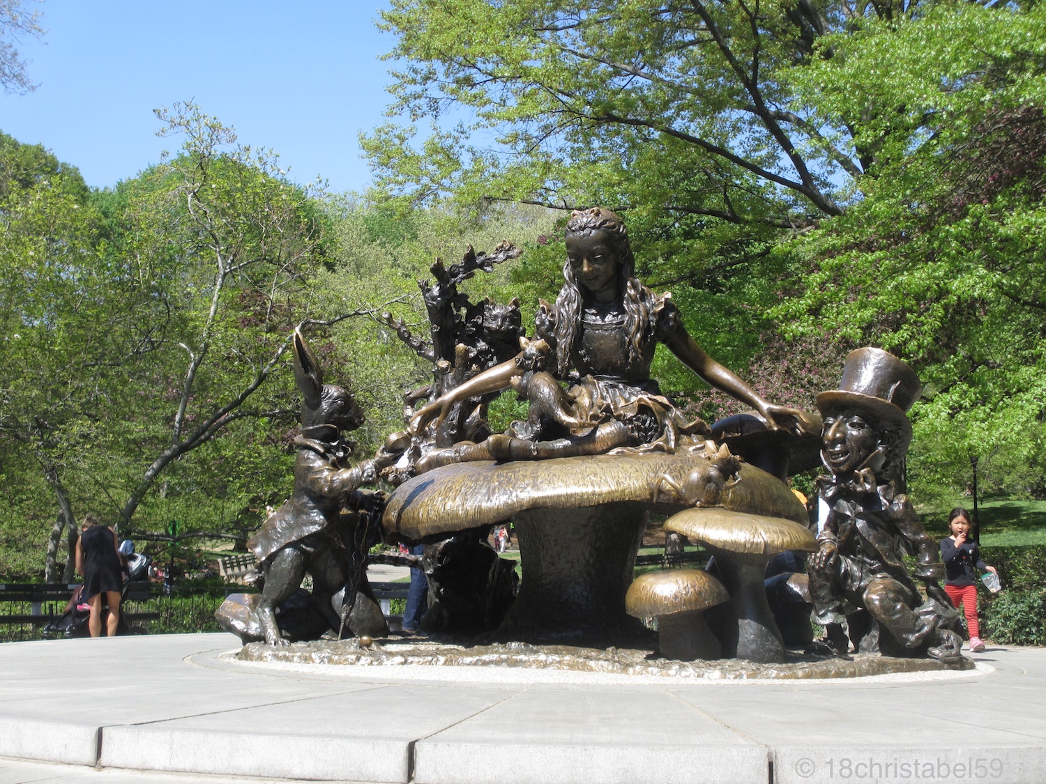 Gleich neben dem Conservatory Lake steht die „Alice in Wonderland“-Statue mit Alice, dem Hasen und dem verrückten Hutmacher, auf die irgendwie fast jeder drauf klettert, egal ob klein oder groß (ja, auch ausgewachsene 50-Jährige machen das…). Um die Statue herum sind Steinplatten im Boden eingelassen, auf denen Zitate aus dem Buch stehen.
