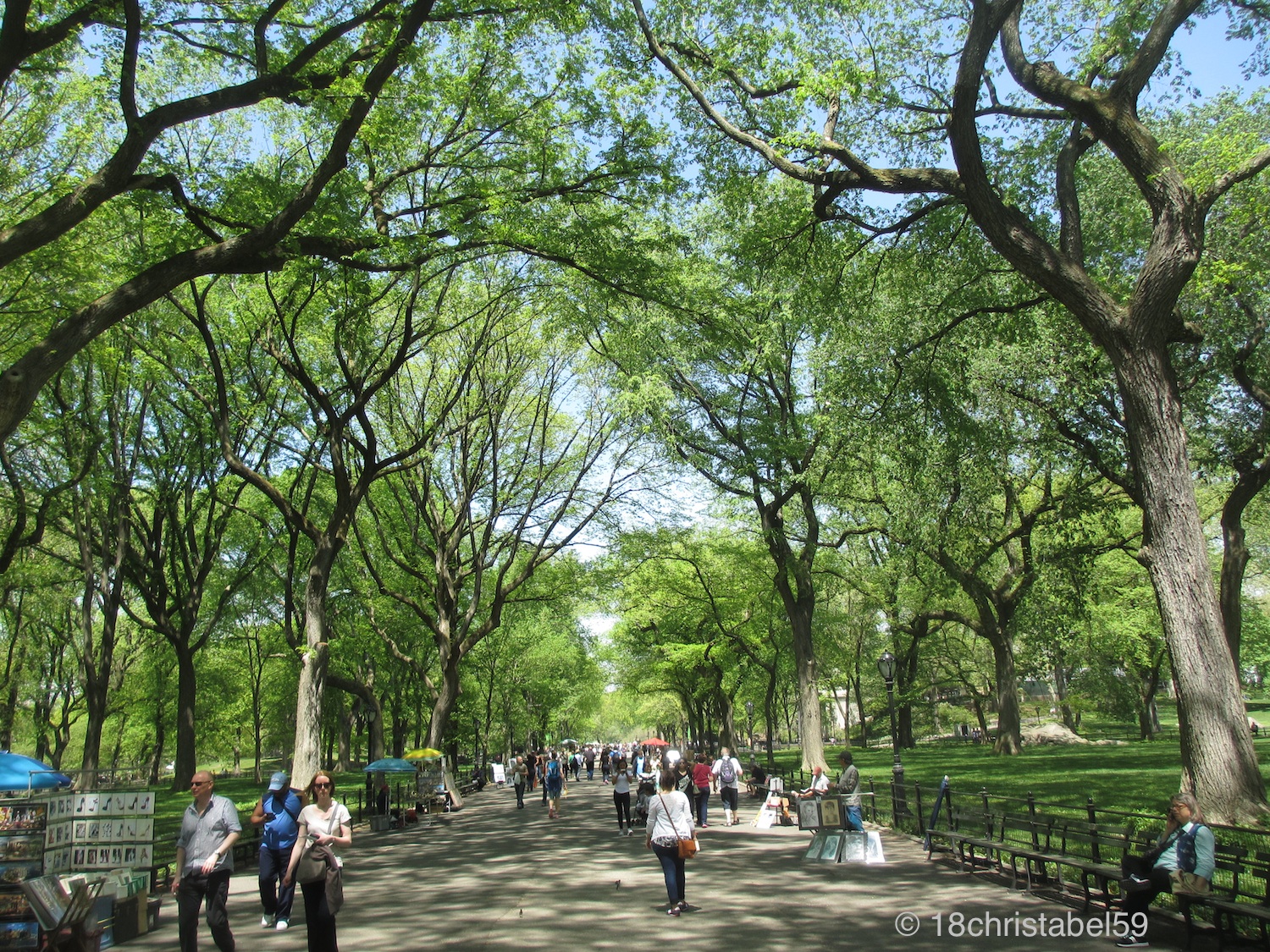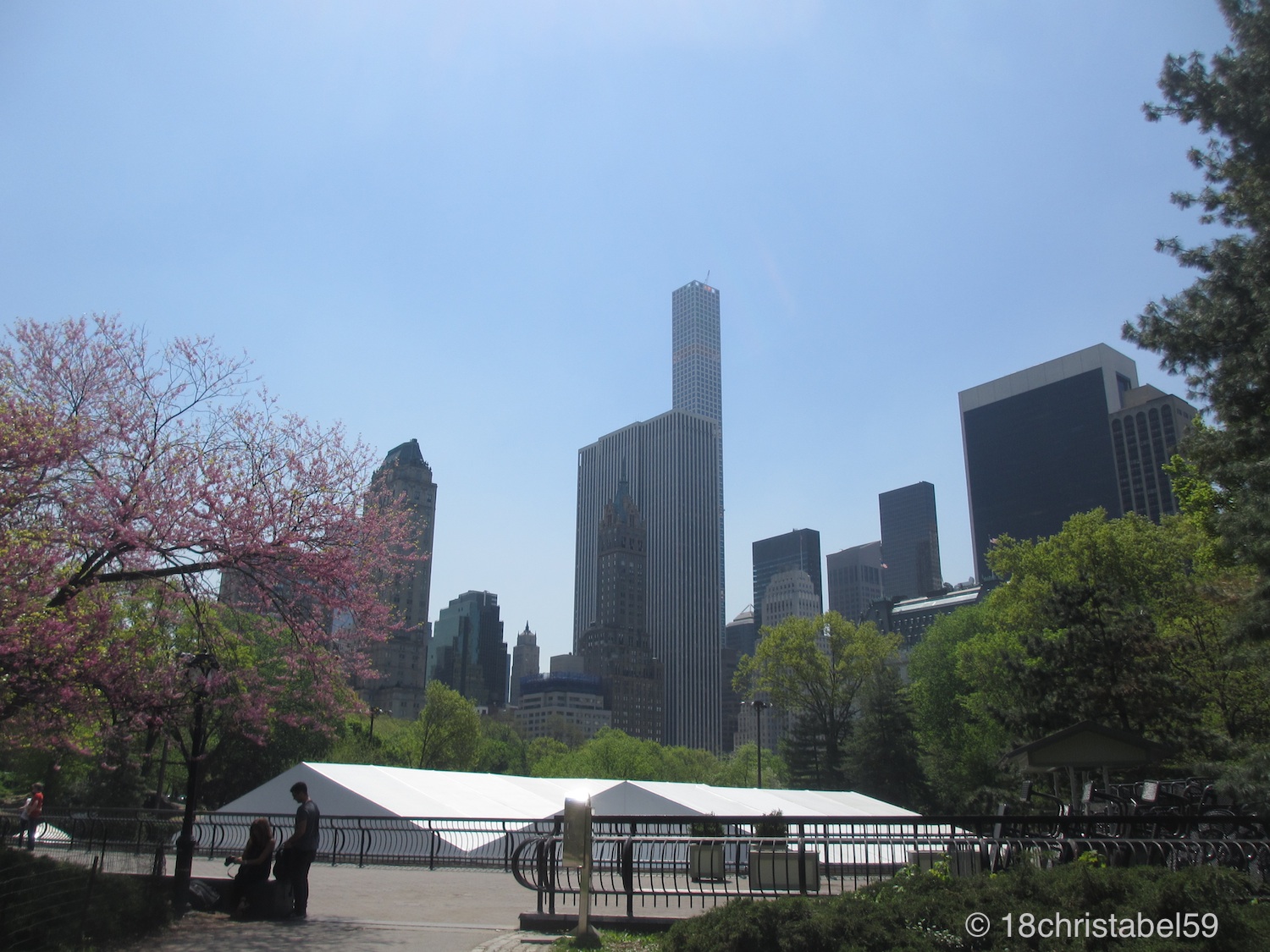 Kaum hatten wir den Central Park betreten, waren wir wie in einer anderen Welt, in einer grünen Oase mit rosa und weiß blühenden Kirschbäumen. Der Lärm der Stadt war wir gedämmt, ein leises Rauschen im Hintergrund. Die Hochhäuser, die den Park umrahmen, wirken wie Modelle und weit entfernt. Wir haben uns einfach treiben lassen und sind am Schachhäuschen in der Sonne versackt, wo ich gepennt bin, weil ich auf einmal todmüde war. Danach weiter ging’s über Dairy, dem Besucherzentrum, der Literary Lane und dem Brunnen mit Treppe, die man beide aus jedem New York Film kennt, zum Conservatory Lake, wo Kinder Motorboote über das in der Sonne glitzernde Wasser des angelegten Brunnens segeln lassen, ein Seifenblasenkünstler vergeblich versucht, große Seifenblasen in die Sonne fliegen zu lassen und fast jede Bank besetzt ist, weil die Besucher kurz entspannen wollen. Auch wenn der Park gut besucht war, so hatte ich nicht das Gefühl, dass es vollgestopft oder eng ist. Es war einfach schön und ruhig und entspannt. Kein Großstadtgewusel mehr.