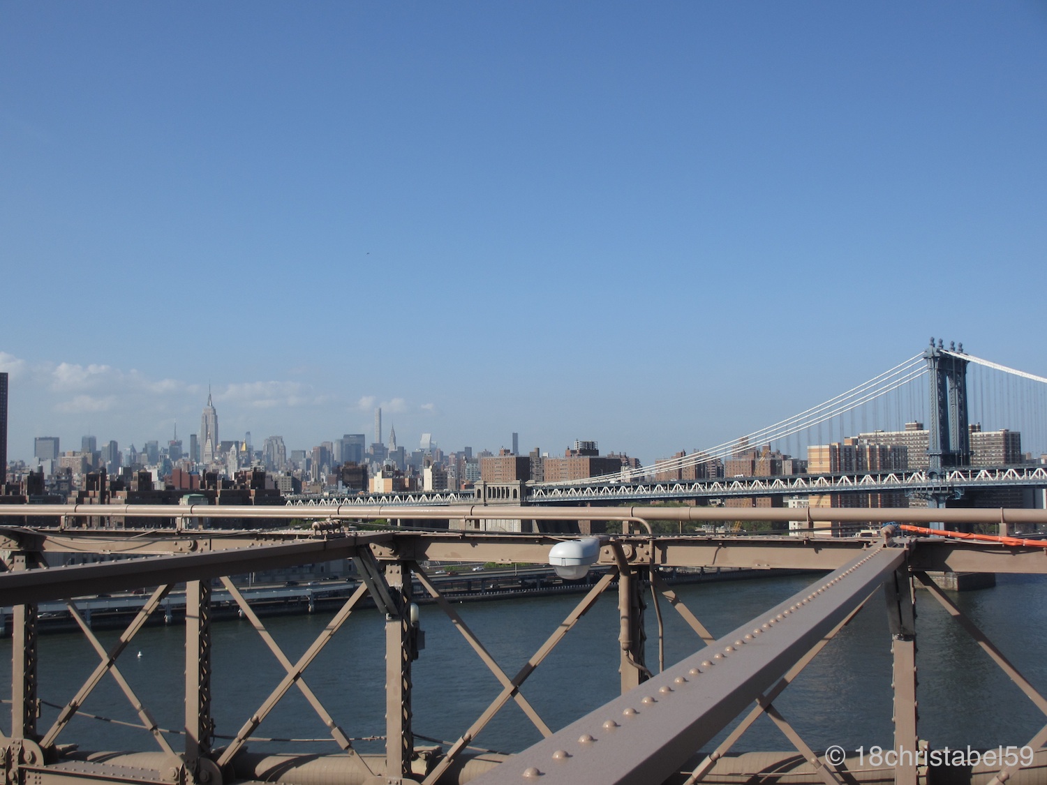 Am Wasser ging es dann bis zur Brooklyn Bridge. Wir sind dem Strom Touris gefolgt, und den versteckten Schildern „Brooklyn Bridge Walkway“, um dann vom Ostende auf die Brücke zu krackseln! Und es ist echt ein Traum, wenn ihr auf die Skyline von Manhattan zulauft! Klar, es ist immer das gleiche Motiv, aber es ändert sich gefühlt alle 5 Meter! Die Brücke an sich ist auch wunderschön (aber für mich nicht ganz so schön wie die Golden Gate Bridge), man kann wunderbar den Verkehr, der unter den Füßen rauscht, beobachten, und man hat einen tollen Blick auf die „Nachbarbrücke“, die Manhattan Bridge… Wer jetzt nicht auf Menschengedränge steht, kann die Nachbarbrücke entlang laufen und hat auch einen schönen Blick auf die Stadt. Denn bei uns war es rappelvoll. Dazu kommt, dass viele alle paar Meter unverhofft stehen bleiben, um Fotos zu schießen, dabei fast in einen Radfahrer, die ja auch noch auf der Brücke hin- und herfahren, reinlaufen und das ganze in einem Riesengebimmel endet, weil die Touris die Radfahrer nicht hören. Es ist also viel Unterhaltung geboten. Ach noch was: Es gibt nur zwei „Spuren“ auf dem Walkway über die Brooklyn Bridge – gen Stadt ist links der Fußgängerbereich und rechts der Fahrradfahrerbereich. Aber auf beiden Spuren herrscht der Hin- und Rückverkehr. Daher ist es immer knackevoll auf dem Fußweg.