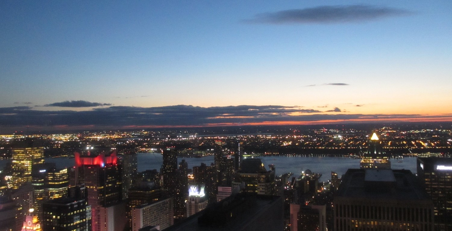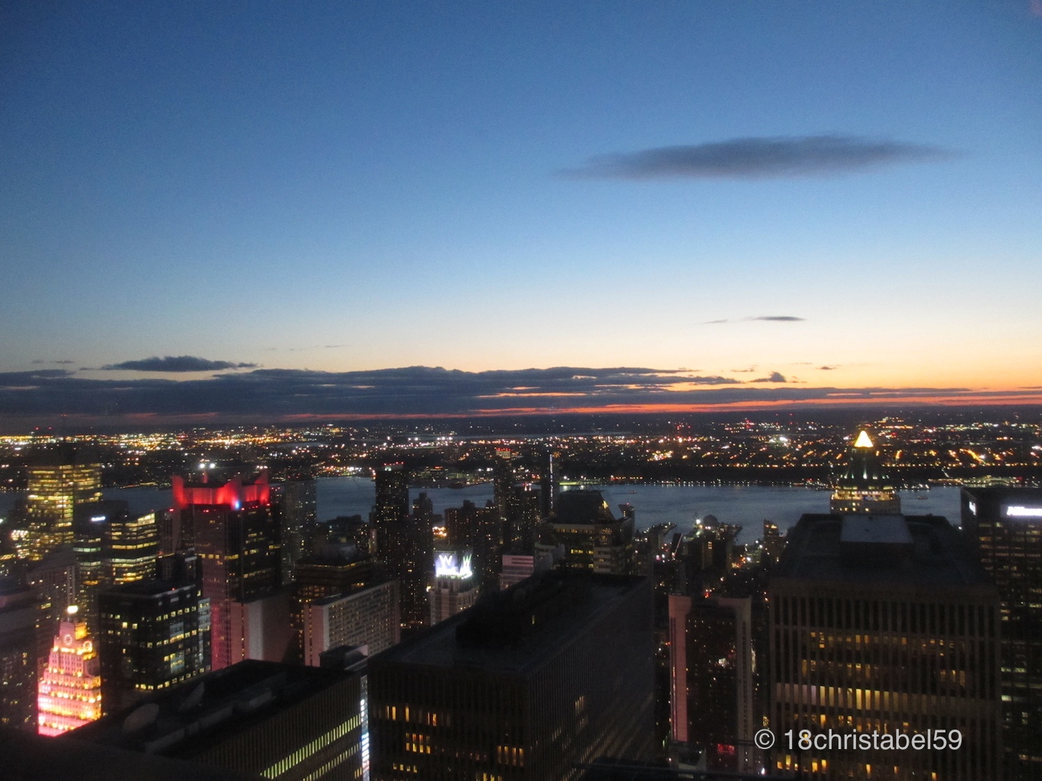 Mit vollem Magen sind wir dann zurück zum Rockefeller Center zum Top of the Rock gekugelt und kurz vor halb 9 mit dem Aufzug, der eine spektakuläre Lichtershow abliefert, auf den „nur“ 56. Stock hoch. Ja, da war das Haus schon zu Ende. Auf dem Observationsdeck pfiff ein eisiger Wind, also vergesst nicht, euch was Warmes mitzunehmen. Im Gegensatz zum Empire State Building gibt’s hier keinen 3 m hohen Zaun, sondern 2,50 m hohe Glaswände, die auf dem rechteckigen Dach für einen „Rundumblick“ sorgen. Der Ausblick auf das Lichtermeer der Stadt ist ebenfalls wunderschön.