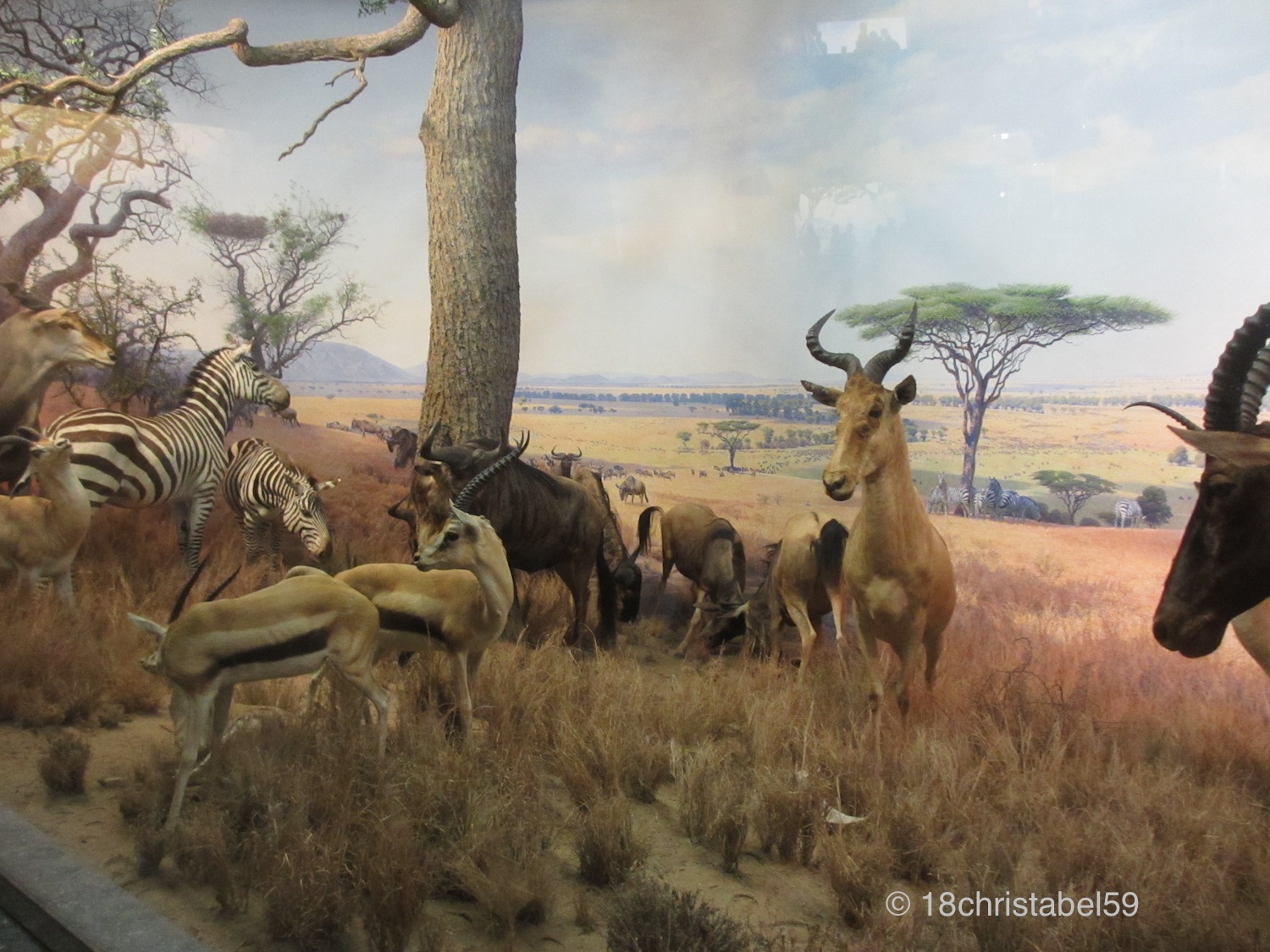 Das Highlight für mich waren die Dino-Skelette, die gefühlt fünf mal so groß wie ich waren. Und die riesigen nachgestellten Landschaftsszenen mit den – leider – ausgestopften Tieren. Vielleicht waren es auch sehr gute Replikate. Auf jeden Fall steht man mitten in der Savanne und sah Löwen beim Dösen in der Sonne zu, war direkt an einem Wasserloch mit Giraffen und Gazellen. Oder aber man war mitten in der amerikanischen Prairie mit einer Bisonherde und in den Wäldern und stand vor kämpfenden Elchen oder auf den Hinterläufen stehenden Braunbären. Oder aber auch mitten in einer Elefantenherde.