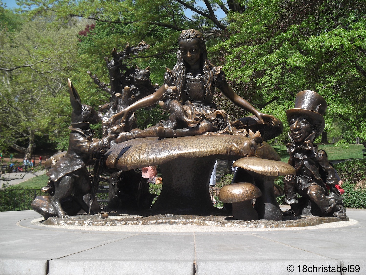 Gleich nördlich vom Segelbootsee ist eine große Statue von Alice in Wonderland mit dem Kaninchen und dem verrückten Hutmacher beim Tee. Und die Maus ist auch dabei. Ich find die Statue echt super! Nervig waren nur die ganzen Touris, die permanent auf die Statue geklettert sind, um sich dann fotografieren zu lassen. Super… Bei Kindern find ich das ja noch süß. Wenn das 50-Jährige machen, hört das Verständnis auf… irgendwo! Um die Statue herum sind schöne Zitate aus dem Roman. So cool!