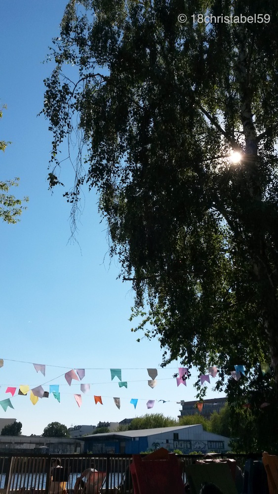 Am Ostbahnhof haben wir uns mit meiner Berliner Freundin getroffen, die ich schon seit Jahren kenne und besuche. Von dort aus ging es schwitzend in eine Strandbar namens Yaam, die meine Berliner Freundin kurz vorher ergooglet hatte. Also sie dachte, es wäre eine Strandbar, wo man sich in Sand an die Spree setzen kann. Aber als wir da ankamen, betraten wir ein eher unebenes Gelände mit eine paar Wellblech- und Pappbuden, die angeblich frisch gekochte Snacks verkauften und eher an einen Imbiss auf Jamaika erinnerten als an eine Curry-Wurst-Bude. Dazwischen standen verramschte Bierbänke, deren Farbe sich abblätterte, und ein Trampelpfad führte an bunt besprühten Sperrholzwänden vorbei an einer anderen Wackelbude und dubiosen Obststand und „Strandladen“. Wir sind den handgemalten Schildern zur „Beach Bar“ gefolgt und waren skeptisch, ob es diese hier wohl geben wird. Es ging weiter über einen ausgetretenen Trampelpfad und Stock und Stein unter den tief hängenden grünen Zweigen vorbei zu einer Strandecke oberhalb der Spree. Hier war es wirklich schön und hatte was von Karibik-Flair. Die „Bar“ war nicht mehr als eine große, zusammengebretterte Holzbude mit englisch sprachigem Personal und auf dem aufgeschütteten Sand standen neben zahlreichen Bierbänken und Ping-Pong-Tischen viele bunte, durchgesessene Liegestühle. Sobald wir ein paar freie Liegestühle gefunden hatten, haben wir sie uns geschnappt und in den Schatten der großen Birke gezogen, die mit bunten Wimpeln geschmückt war. Denn nur im Schatten war die Hitze erträglich. Die Füße wurden in den kühlen Sand gesteckt und dann stand der allgemeine Mädelsaustausch auf dem Programm. Nebenbei waren wir nicht nur von der herrlichen Aussicht auf die in der Sonne glitzernden Spree vor uns abgelenkt, sondern auch, oder wohl viel eher, von den leichten Rauchwolken, die immer wieder an uns vorbei zogen. Da bekam der Begriff „Grüne Lunge“ mal eine ganz neue Bedeutung. Und unser Karibik-Feeling stieg.
