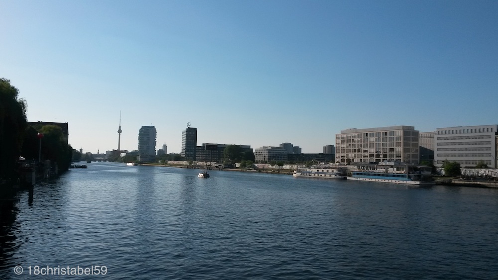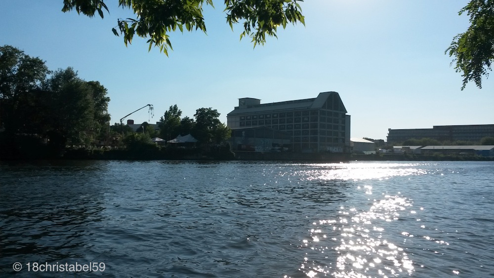 Wir sind dann an der East Side Gallery, ein Stück Berliner Mauer mit verschiedenen Gaffitis dekoriert – beidseitig, entlang geschlendert, und dann direkt die Spree. Hier kann man sich unter den kleinen Bäumen und Büschen direkt auf die Quaimauer setzen und seine Füße über dem Fluss baumeln lassen. Es gibt auch hier nur kleine Trampelpfade, die zum Uferrand führen, dafür ist es aber wirklich ruhig. Und wenn man so seine Füße baumeln lässt, kann man ganz entspannt das andere Ufer mit seinen gefüllten Clubs und Strandbars beobachten. Die Sonne tauchte alles in einen goldenen Schimmer, so dass die alten Industriehallen etwas Romantisches haben. Schlager und Electropop-Klänge schallten von der anderen Seite zu uns rüber, und wir haben uns gefragt, wie man sich solche Musik antun kann. Gelegentlich durchkreuzten verschiedene Ausflugsboote unseren Sommerausblick auf Berlins chillige Seite: Vom kleinen Zwei-Mann-Kanu, über das DLRG-Boot hin zu diversen Kaffeedampfern, auf dessen Relingen sich die Besucher oder Feierabendgenießer tummelten. Das Gute an diesen Vorbeizüglerbooten waren die Wellen, die in Richtung Ufer schwappten. Die Mädels und ich setzten uns etwas schräger ans Ufer, um wenigstens mit der einen Fußspitze ins kühle Nass der Spree zu kommen. Ja, das war schon etwas akrobatisch, aber es hat was gebracht, wenn die Bugwellen zu uns kamen. Keine Ahnung, was so alles in der Spree rumkreucht und fleucht, aber das Wasser ist bei 30 Grad im Schatten einfach nur herrlich. Außerdem waren wir nach fünf Minuten eh wieder trocken und die Füße noch dran.