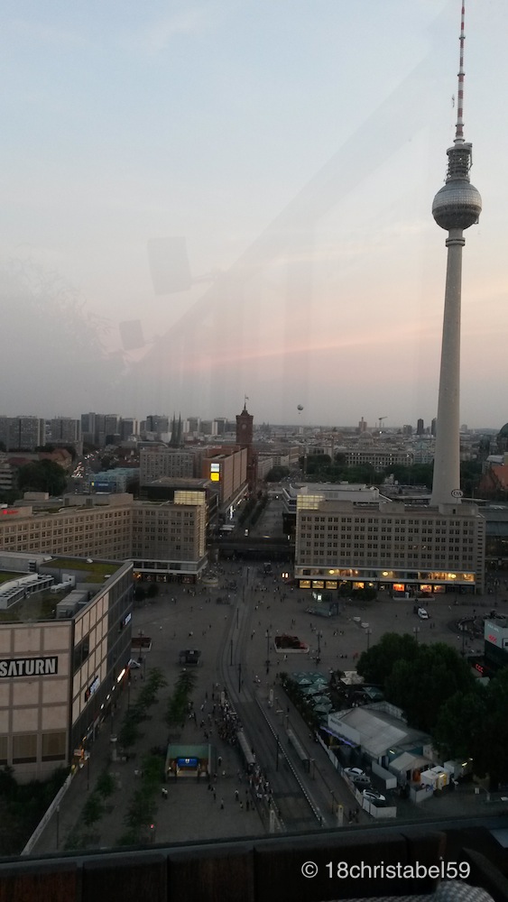 Nachdem wir uns gestärkt hatten (und unsere Zungen wieder spürten), ging es für meine Freundin und mich noch zum Alex in einen Club mit dem verlockenden Namen House of Weekend. (Keine Ahnung, was das mit Wochenende zu tun hatte, vielleicht weil der Club nur am Wochenende offen ist?!) Das mittelgroße Hochhaus wirkt auf den ersten Blick, ehrlich gesagt, wenig beeindruckend, hat eher wie ein DDR-Plattenbau. Auch der Flur und der Aufzug hat wenig Einladendes. Einmal ganz oben angekommen, geht man erst mal durch einen recht leer erscheinenden Club, mit kleiner Tanzfläche und rechteckiger Theke mitten im Raum. Recht davon vorbei geht es über vier steile Betontreppen vorbei an aufregender Wanddekoration (guckt euch ruhig mal die Bilder an, die da so hängen…) auf die Dachterrasse, die mit Glasfronten geschützt ist. Aber kaum ist man da oben, hat man einen atemberaubenden Blick über ganz Berlin: Man sieht nicht nur den Alexander Platz unter sich, mit Weltzeituhr und dem Roten Rathaus, man erkennt das Brandenburger Tor, den Bundestag, die Siegessäule, das Sony Center… Man ist erst mal so geflasht von der Aussicht, dass man ganz überrascht ist, wenn man von der eifrigen Kellnerin angesprochen wird. Aber das Atemberaubendste da oben auf dem Dach des „House of Weekends“ ist, den Sonnenuntergang über den Dächern Berlins zu beobachten und dann zu sehen, wie langsam die Lichter der Stadt zu leuchten beginnen.