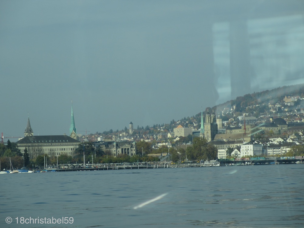 Und irgendwann öffneten sich die Häuserfronten wie ein Vorhang und wir waren auf dem offenen Zürichsee, gefühlt mitten drin. Die Sonne glitzerte auf den Wellen des dunkelblauen Sees. Zur einen Seite lag die Kulisse in einem goldigen Schimmer, zur anderen Seite waren im Hintergrund schemenhaft die Berge zu erkennen, darunter auch der Mast vom Uetliberg, der sich zur Westseite des Züri-Sees gen Sonne ragte. Und dann sind wir an den schneeweißen Segelbooten vorbei getuckert, die wie elegante Schwäne über das kühle Blau glitten. Am Zürichhorn war die andere Endstelle der Fluss-Bus-Route, hier wurde gedreht, viele stiegen aus, um an der Promenade zurück zur Stadt zu schlendern.