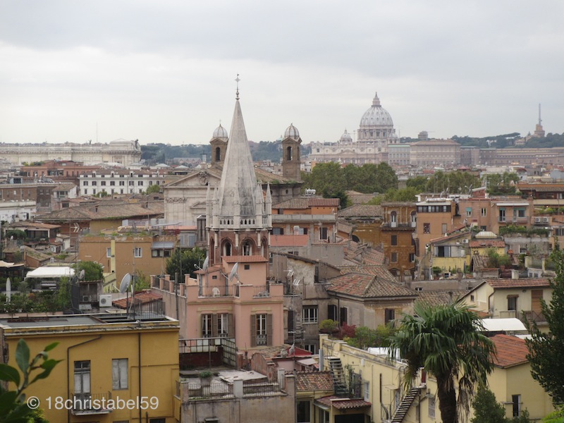 Wir sind dann weiter und wieder runter zur imposanten Villa Medici (dieser Familie, die mal halb Europa regiert hat). Gegenüber dieser Villa kann man vom Fußweg mit seiner kleinen Mauer in die nah angegrenzenden Wohnhäuser blicken, die von den Straßen unterhalb nach oben ragen. Hier saßen Touristen oder Einheimische in der Sonne bei einem Pläuschchen. Aber ich habe die Aussicht in die kleinen Gassen, auf Balkone und Dachterrassen genossen. Hier zeigt Rom für mich eine sehr private Seite. Und wenn man wie ich auf die kleine Mauer steigt, hat man einen wunderbaren Schnappschuss von der privaten Seite. Einfach wunderschön.