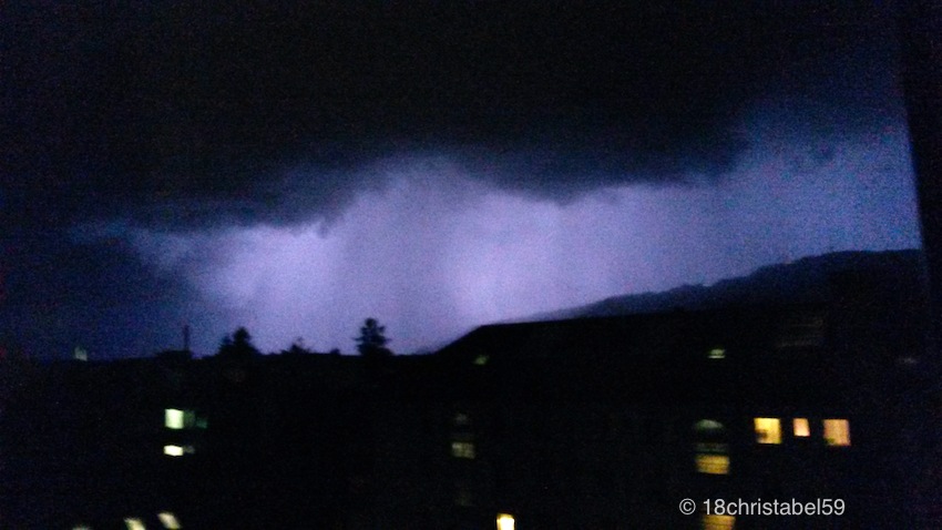 ich hab hier gerade noch einen Beitrag fertig gemacht, als über der Stadt erst ein Wetterleuchten aufzog und dann ein kurzes Gewitter runterkam. Ich bin ja von so was immer total fasziniert. Wie die Energie in den Wolken die dunkle Stadt wieder taghell erleuchten lässt und dabei den Himmel blau oder lila oder rosa färbt. Ein Traum und total genial. Genau wie die Blitze, die sich in sämtlichen Verästelungen in filigranen Neonlinien über den bunten Horizont ziehen. Danach folgt das Grollen des Donners in weiter Entfernung und dazwischen höre ich die ersten Tropfen des Regens, die sich in ein sanftes Rauschen verwandeln. Dazwischen erhellen Blitze den pechschwarzen Nachthimmel über Zürich. Wie ein Kloppi hab ich geduldig mit gezücktem Handy gewartet und versucht die Blitzmomente aufzunehmen… ja, wie gesagt, mim Handy. Kaum wurde es hell, wollt ich blitzschnell reagieren und das Naturwunder in all seiner Pracht aufnehmen, aber ich Schnecke war meistens zu langsam. Mit der Kamera hab ich’s auch versucht, aber die Nuss hat die Fensterscheibe fokussiert… Daher folgen jetzt die schönen Ergebnisse meiner Handyaufnahmen des traumhaften Sommernachtgewitters über Zürich. Ich find’s schade, dass es schon wieder rum ist. Ich hätte noch ein bissl länger zugucken können.