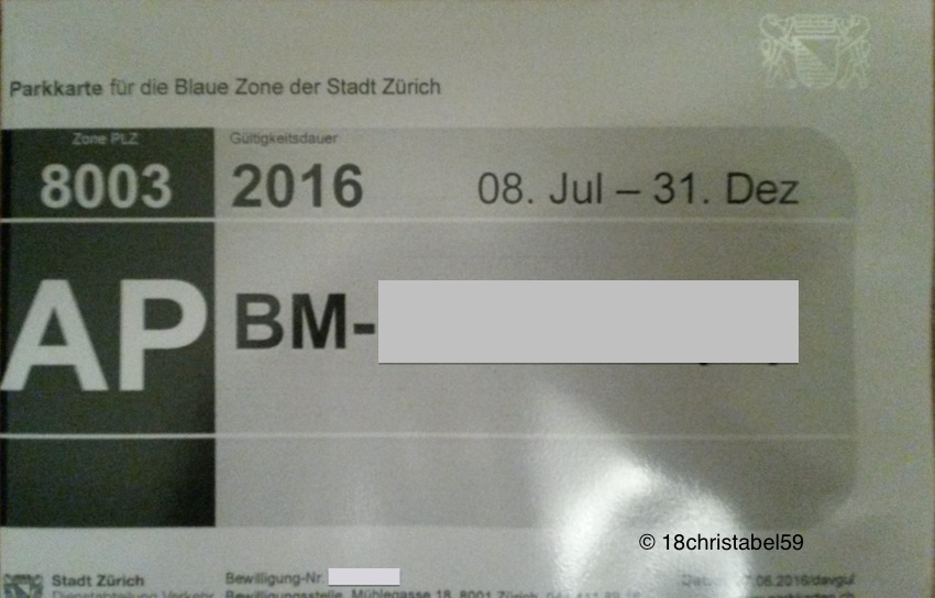 Jedenfalls hab ich da gleich im Internet nach Standort und Öffnungszeiten der Dienststelle geguckt und hab dort angerufen. Ja, ich bräuchte nur meinen Fahrzeugschein mitbringen, mehr nicht. Also zack, bin ich da hingeradelt (ja, wirklich mit dem Rad) und hab da ganz ohne Probleme eine Parkkarte für das restliche Jahr 2016 bekommen. Sie ist anschließend an meine vorläufige Karte gültig und hat CHF150 gekostet. Bezahlen kann man bar, mit EC- oder Visitekarte (Achtung anfallende Gebühren!!). Für das ganze Jahr kostet die Karte CHF300.