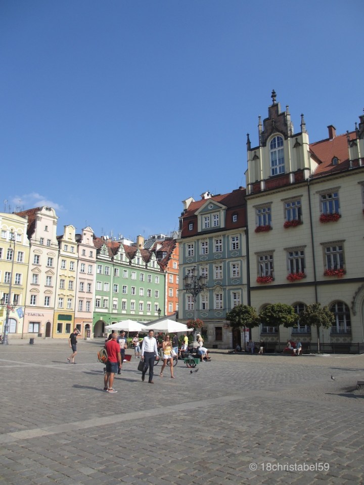 Kaum hatten wir uns Lody naturali („Bio“-Eis) aufgeschleckt, sind wir schon am Marktplatz gewesen und von da an, war ich völlig von Breslau begeisert. Diese vielen schmalen, breiten, reich verzierten bunten Häuser mit ihren verschiedenen Giebeldächern erinnerten mich vor allem an Hansestädte wie Stralsund oder Kopenhagen, aber auch sehr an Maastricht. Richtig krass ist das Rathaus, das die Besucher mit seiner imposanten Fassade und einem Kirchturm begrüßt. Der Marktplatz ist eher ein Quarré mit einer breiten, platzartigen Straße namens Rynek, an der sich die farbenfrohen Häuser aus dem 17. und 18. Jahrhundert drängen. Einfach so wunderschön.