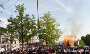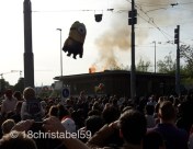 Also hatte ich mich mit meinem Französisch-Tandem-Partner zum Böögg-Abfackeln-Gucken verabredet. Punkt 18 Uhr war ich am Sächsilüüteplatz. Naja fast. Da waren noch einige tausend andere Leute und ich musste mich erst mal durch die Menge zum Baum an der Brasserie kämpfen, da stand der Franzosen. Kaum drängelte ich mich hinter ein paar Fischern (?) durch die Leute, gab es einen Megaknall wie ein Kanonendonner und die ersten Fetzen vom Böögg flogen in die Luft. Dazu ging ein Jubel durch die Menge. Während ich mich so durch die Leute schob, fielen mir immer wieder Frauen mit Blumensträußen auf und Männer in Uniformen oder Zunfttrachten aus dem 17. oder 18. Jahrhundert, mit Knickebocker, Gehrock, Perrücke und Dreispitz. Dann donnerten wieder kanonenartige Knalle über den Platz und der Böögg flog endgültig in die Luft. Das Feuer des Scheiterhaufens ist gewaltig und selbst da, wo ich in der Masse stand, konnte ich die letzten Fetzen des armen Schneemanns in den Flammen aufgehen.