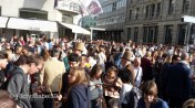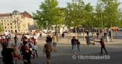 Zur grossen Freude der Menge hat die Verbrennung dieses Jahr keine 10 Minuten gedauert, und nicht wie letztes Jahr 45. Heißt, der Sommer kommt zackig. Die ersten Reaktionen, die mir auf den verbrannten Schneemann entgegen kamen, waren: „Gut, dann können wir jetzt gehen.“ Und Leute, die sich zum Gehen vom Sechseläutenplatz abwandten. Krass. Erst „Yeah“ und dann „Komm, wir gehen!“. Aber gut, dadurch hab ich den Franzosen schneller am Baum neben der Brasserie und dem Pandaluftballon gefunden.