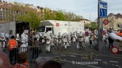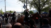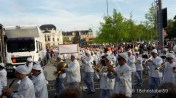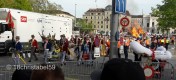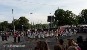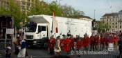 Wir haben uns dann durch die wirklich rappelvolle Menge auf die andere Seite des Sechseläutenplatzes schieben lassen, also da am Bellevue, wo wir nach und nach den Zünften beim Abzug vom Platz zugeschaut haben. Dabei marschieren sie mit Marschkappellen oder Trommlern und allerlei Trachten vom 15. bis 20. Jahrhundert vom Platz. So eine richtige Logik konnten wir nicht dahinter erkennen. Aber wir haben versucht, anhand der Flaggen und Trachten die Zunft zu erraten.