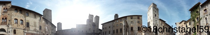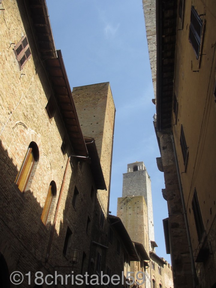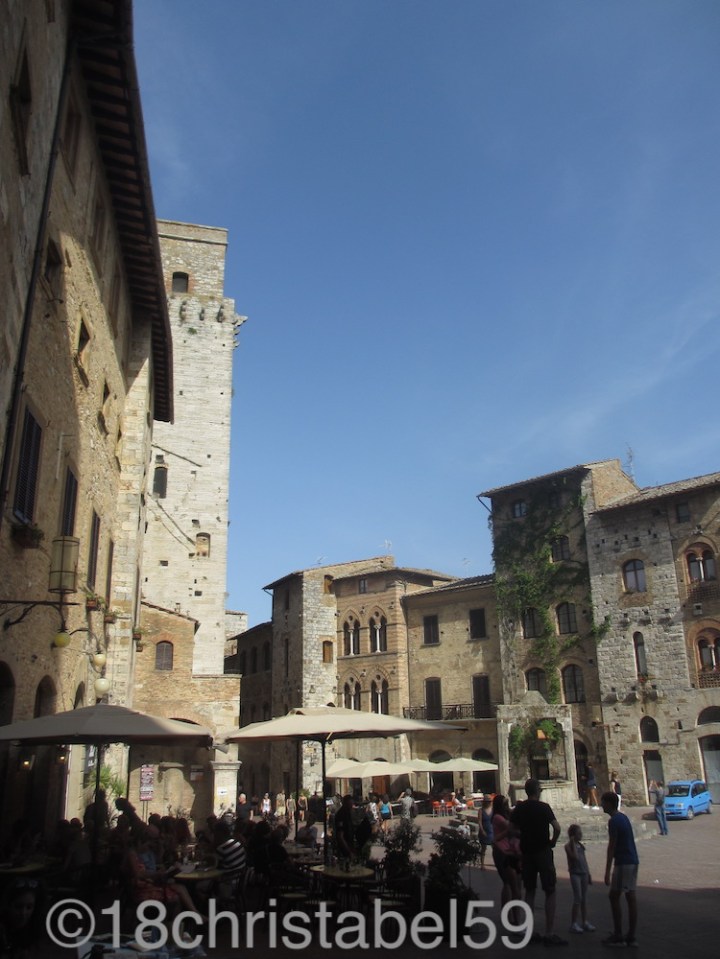 Nachdem wir unsere letzten Eisreste ausgeschlürft hatten, sind wir weiter zur Piazza della Cisterna, der Platz mit dem Brunnen in der Mitte und der wunderbaren Häuserkulisse aus den mittelalterlichen, mal mehr, mal weniger verzierten Bauten, aber mit einem tollen Blick auf die Türme. Panoramafotoalarm.
