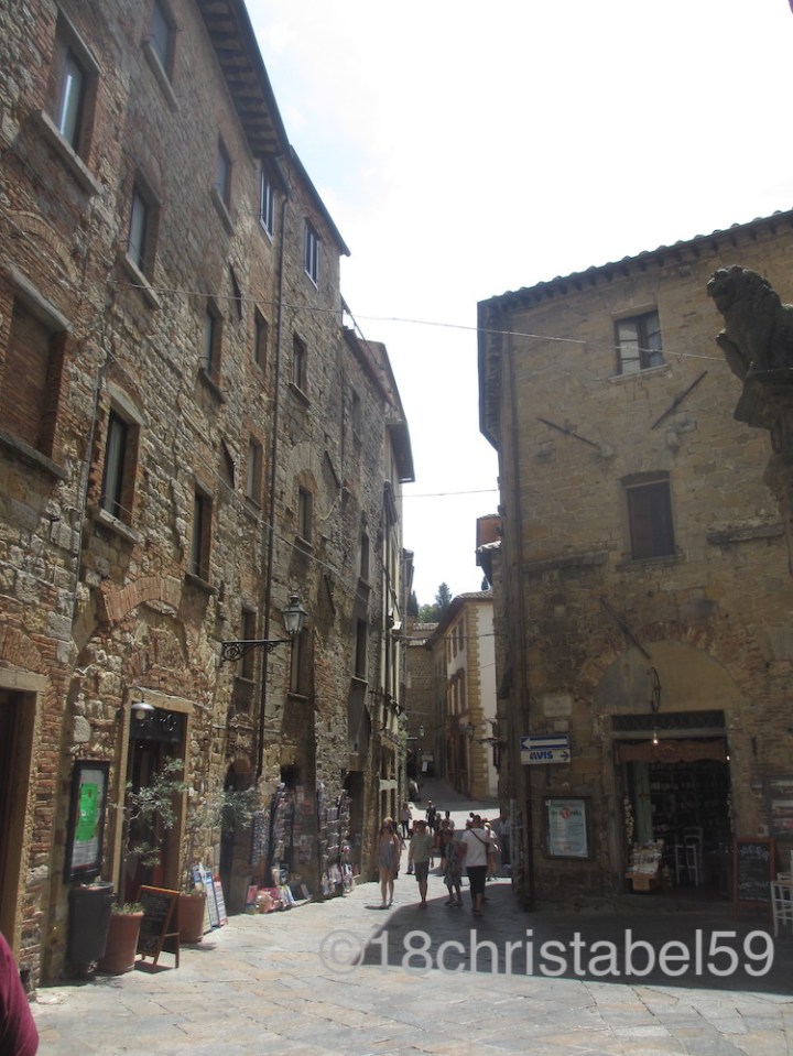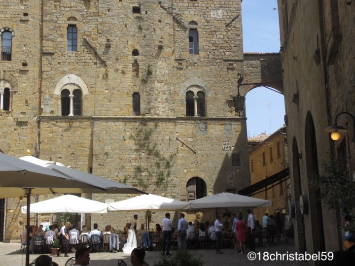 Sehenswert ist auf jeden Fall das burgartige Palazzo dei Priori, der Kommunalpalast im venezianischen Stil mit seinem hohen Turm und der gleichnamige Platz davor. Laut Reiseführer ist dieser Palazzo aus dem 13. Jh. der älteste seiner Art in der Toscana. Und genau vor diesem Palazzo sass die Hochzeitsgesellschaft unter weissen Schirmen. Trotz der neugierigen Touristen um sie herum hatten die Feiernden ihren Spass und liessen sich nicht stören, auch nicht als der laue Wind mit dem Schleier der Braut spielte.