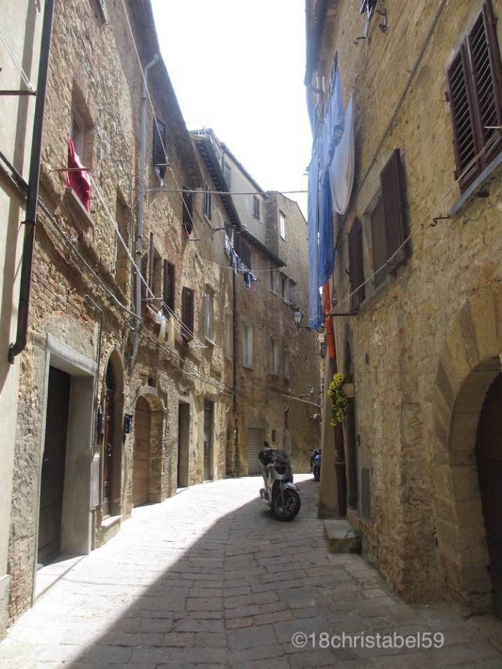 Also zurück zu Volterras Verschlafenheit. Die kleine Stadt hat echt wunderschöne Ecken mit typischen Motiven für Postkarten aus der Toskana. Hier gab es ein kleines Kreuz-und-Quer von engen Gassen, gesäumt von alten, hohen Häusern. Alles in braun-gelben-roten Farben, rustikal, mit abbröckelnden Putz, mit kleinen Ristorante, die mit rot-weiss-karierten Stofftischdecken auf den Terrassen zum Verweilen einluden, mit Blumenkübeln vor Türen und bunter Wäsche, die an kleinen Wäscheleinen unter den Fensterbrettern im lauen Sommerwind wehte, mit Holzfensterläden, von denen auch der farbige Lack abblätterte. Die Häuser waren hier so hoch bzw. die Kopfsteinpflastergassen so eng, dass die Sonne kaum auf den Boden kam. Bei 30 Grad in der Sonne war das wirklich angenehm.