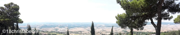 Gut, losgefahren, über die Landstrasse, die wir vor zwei Tagen schon ans Meer gefahren sind, vorbei an den gleichen Feldern, Wiesen, Höfen, Dörfchen. Und es war immer noch wunderschön unter der strahlenden Sonne Italiens. Von Weitem sieht man Volterra auf einem grösseren Hügel in der gelb-braunen Landschaft thronen, mit seinen braunen Türmen und der prägnanten Stadtmauer. Die Auffahrt war nach wie vor eng, einige Touristen haben die Parkplätze weiter unten im Ort genutzt, aber wir waren faul und sind bis an die Stadtmauergrenze gefahren. Dort gibt es ein einziges, sehr sehr begehrtes Parkhaus (namens Parcheggio San Felice), in das wir mit etwas Warten auch reingekommen sind. Aber Parken ist da vielleicht scheisse, weil alles sehr eng ist und die Parkplatzsuche an eine Ostereiersuche erinnert. Und manche Autofahrer parken auch nicht wirklich schlau da und versperren die Durchfahrten. Das Parkhaus hat seinen Namen nicht umsonst: Heiliger Felix, der Glückliche… Egal, wir hatten Glück und einen Platz gefunden und kaum sind wir aus dem Parkhaus gekommen, eröffnete sich auf der anderen Seite, an der Stadtmauer die gelben Weiten der Toskana – ein traumhaftes Panorama durch die Pinien über die Landschaft um Volterra.