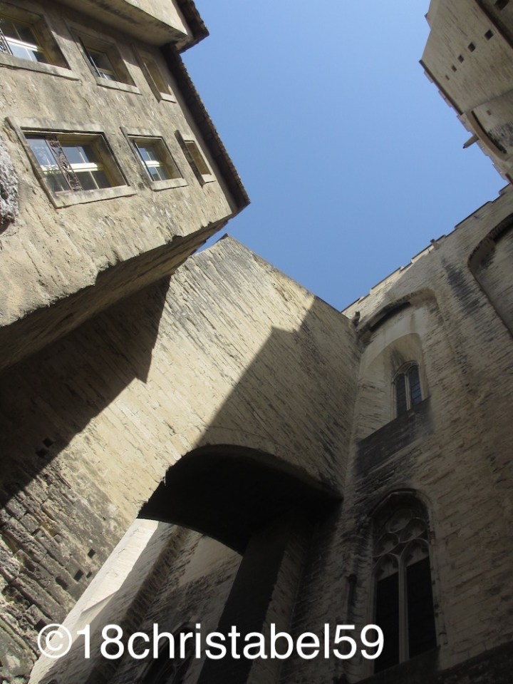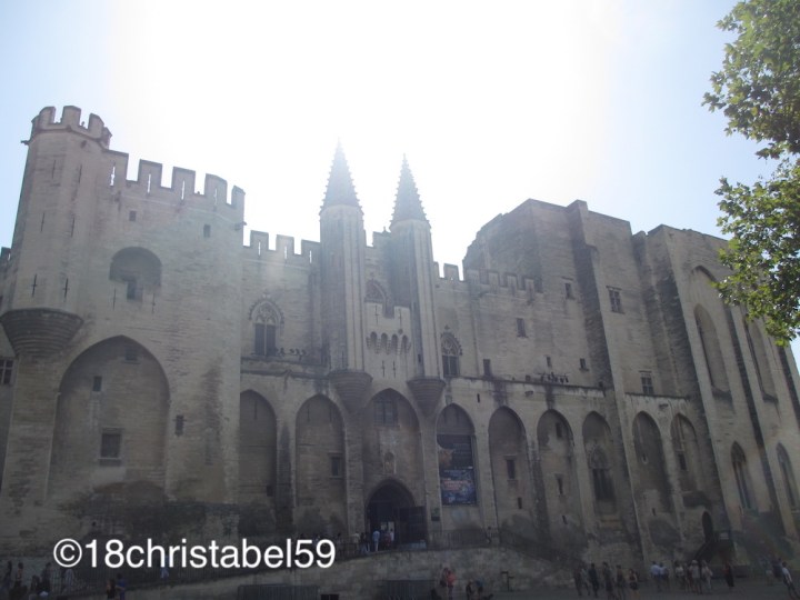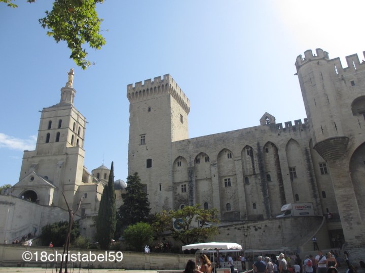 Wir haben uns treiben lassen und sind dann durch Zufall von anderen Seiten zum Papstpalast gekommen. Die Gasse, sorry, die Rue de la Peyrolerie, is ne „Strasse“, wurde hier immer enger und der Palast thronte auf dem gelben Felsen über uns und der Stadt, einfach majestätisch, riesig, und eindrucksvoll. Weiter oben in dem Felsen am „Fuss“ des Palastes hatte sich ein Obdachloser eingerichtet und wurde auch von einer alten Frau versorgt. Das war echt schön mit anzusehen. Ach ja, der Papstpalast war nicht ohne Grund hier, denn der Papst hat hier mal für so 400 Jahre residiert. Daher musste man(n) sich ja auch häuslich einrichten, mit halt so nem Bunker, der über alle Häuser der Stadt ragt. Musste man ja sehen können, was man so hat oder kann…