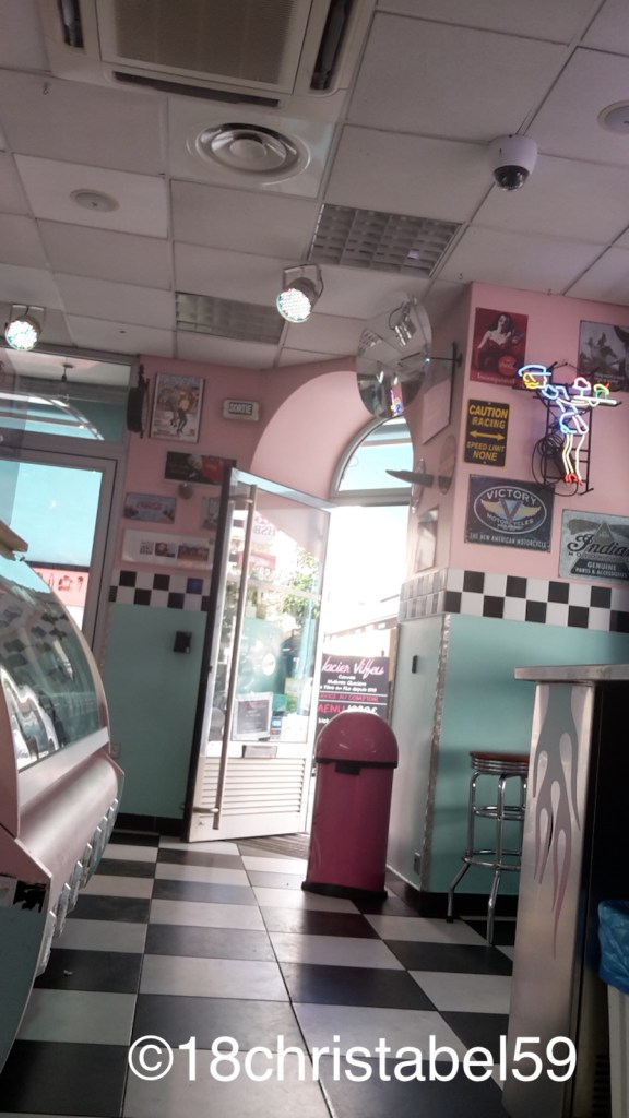 Das Eiscafé Glacier Vilfeu war kaugummirosa mit türkis, schwarz-weissen Fliessen und verchromter Theke, Tischen und Stühlen, ganz im Stil eines amerikanischen Diners aus den 50ern. Das Eis war durchaus lecker, es gibt auch recht viel im Angebot.