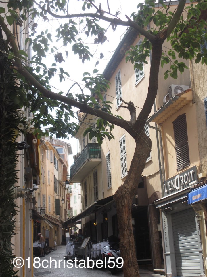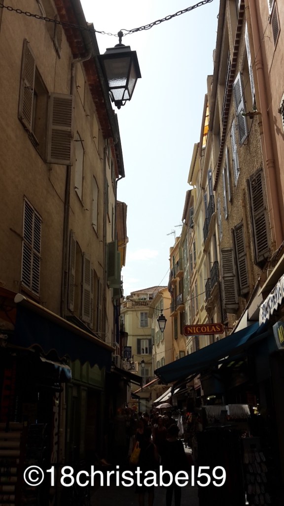 Danach ging es weiter in die Rue Meynardie, wobei „Rue“ (Strasse) hier auch übertrieben ist. In der breiteren Gasse drängen sich gelbe, beige oder olivgrünen Häuser mit kleinen Balkone und hohen Fensterläden aneinander. Im Erdgeschoss eines fast jeden Hauses waren ein Feinkost- und Tourigeschäft nach dem anderen zu finden. Hier hat man so alles gekriegt, was Südfrankreich zu bieten hat: Töpferwaren, Olivenöl und Oliven, Käse, Seifen, Kerzen, Wein, Backwaren, wat weiss ich. Es gab kleine Boutiquen und auch Frisöre, Kneipen, Cafés, und Laternen, die mitten über der Gasse hingen. Alles war total urig, rustikal, mit einem unwiderstehlichen Charme, den man in dem eleganten Cannes, dem Ort der Schönen und Reichen, gar nicht so vermutet. Und hier wimmelte es von Leuten, die sich entweder ihren Einkauf für den Tag oder einfach für die Reise erledigten.