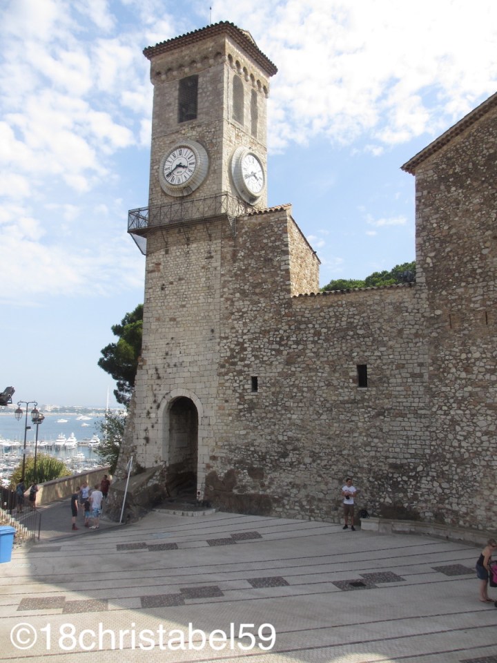 Abschliessend sind wir noch zur Kirche Notre Dame d’Esperance am westlichen Ende des Zentrums rauf gestiegen. Um da rauf zu kommen, muss man durch schattige, verwinkelte Gässchen mit bunten Pflastersteinen, schmalen Häusern mit farbigen Markisen und Fensterläden, dazwischen Bäume und blühende Topfpflanzen, die mit ihrem Grün den Gassen was Verträumtes gaben. Kleine versteckte Treppen verbinden das Gassengewirr. In der Rue du Suquet (auch eher eine Gasse als eine Strasse) wimmelt es von kleinen Restaurants, in denen gerade die Tische fürs Abendessen hergerichtet und die Getränkevorräte aufgefüllt wurden.