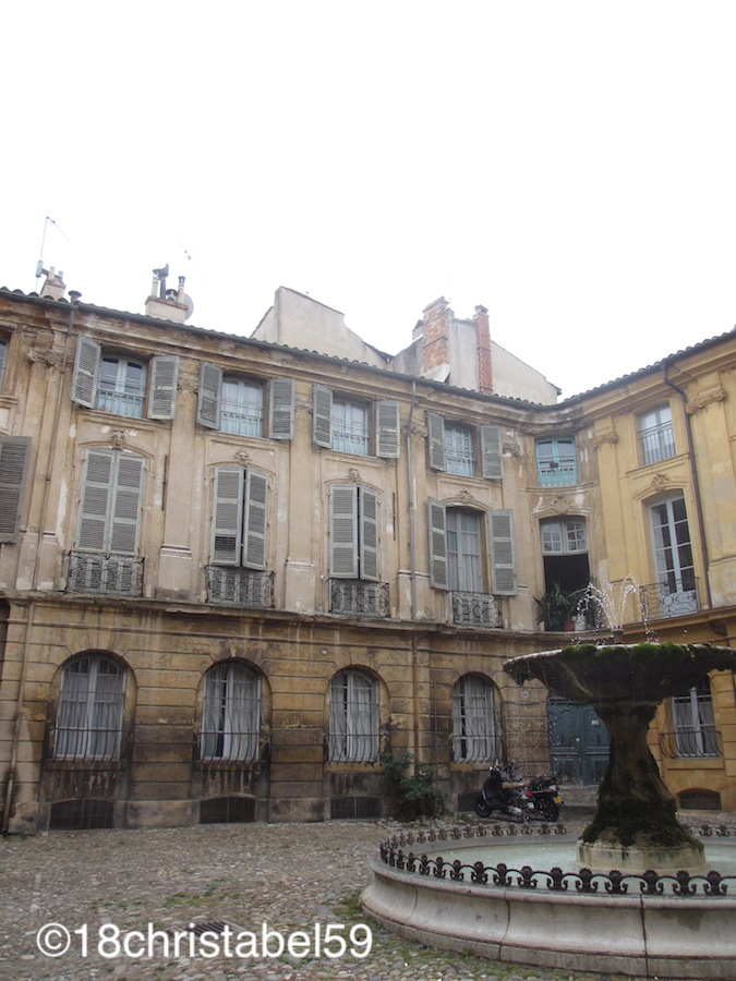 Es war einfach wunderschön, bis zum Mittagsstau in Aix-en-Provence, den wir dank Navi umfahren konnten. So sind wir dann im Parkhaus am Rontonde, am gleichnamigen Platz mit einem fetten Springbrunnen drauf, und einem Einkaufszentrum am südlichen Ende des Stadtkerns, gelandet. Der Rontonde liegt am unteren Ende der Cours Mirabeau, der Flaniermeile der Stadt mit einer Akazienallee, die Canabière sozusagen, an deren Kreuzungen ein kleiner Brunnen mit grünem Moos und Wasserpflanzen, die sie ganz verwunschen aussehen liessen.