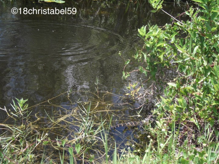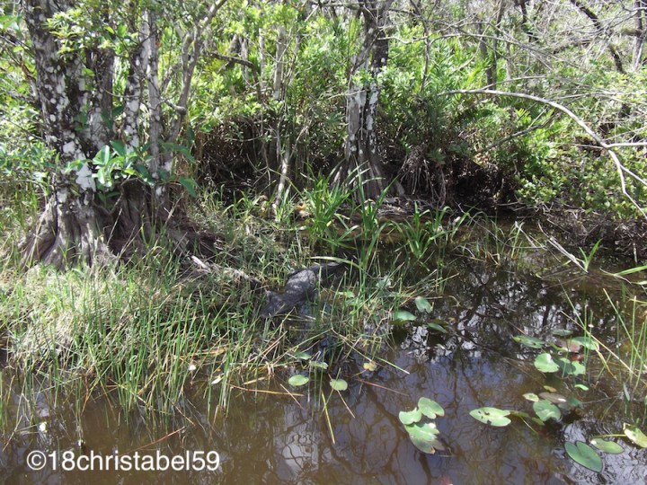 Royal Palm mit dem Anhinga Trail und dem Gumbo Lie Trail (jeweils 30 min ca.) ist gleich am Parkanfang. Vom Parkplatz aus kommt man sofort an eine Art Teich mit Flussbett, das dann in die Weite der Everglades verschwindet bzw. in einen anderen grösseren Teich mündet. Aussen herum wachsen kleine Mangrovenbäumchen und hohes Schilf, das typisch für die Region ist. Ein echt toller Anblick: Wilde Natur pur. Und die Rangerin im Visitor Center hatte Recht: wir haben Alligatoren gesehen und das nicht zu wenig. Sie haben sich am Rand versteckt oder schwammen gediegen durch das seichte Gewässer.