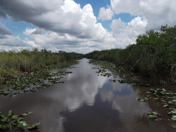 Jedes Mal, wenn ein Tier oder Tiere in der Nähe waren, hat der Guide die Geschwindigkeit sehr gedrosselt und ist an den Tieren vorbei geschwommen. Aber wenn mal freie Fahrt möglich war, wurde Gas gegeben, aber nicht übertrieben. Und dann ist es schon ein cooles Gefühl, so durch die Everglades zu schippern, mit dem Fahrtwind um die Nase, dem vorbei rauschenden Schilf, den natürlichen Wasserstrassen, in den sich der blaue Himmel mit Schäfchenwolken spiegelt.