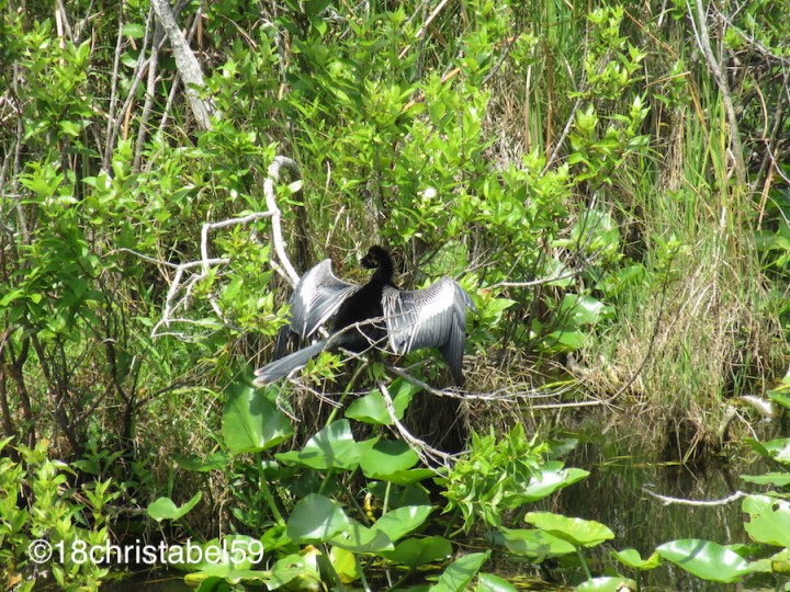 Aber die Everglades haben noch mehr zu bieten: Wir haben auch Anhingas (Schlangenhalsvogel) gesehen. Das sind Vögel, die keine Fettdrüse haben, aber tauchend Fische jagen. Mit der Konsequenz, dass ihre Federn aussehen wie Fell und somit regelmässig getrocknet werden müssen. Dafür lungern die Anhingas dann breiflügelig auf den Ästen rum und geben dabei seltsam röhrende Quaklaute von sich.