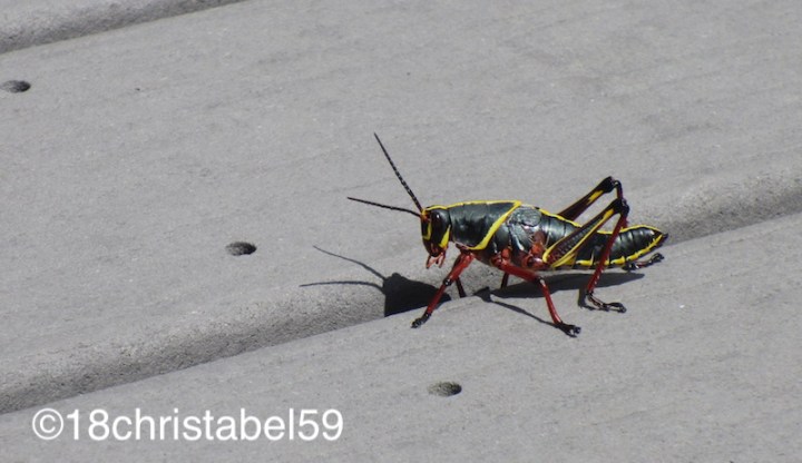 Dann haben wir noch viele verschiedene Fische in den Teichen gesehen, in allerlei Grössen und Farben. Am markantesten ist der Florida-Hecht mit seiner Grösse und Punkten. Und es gab viele Schildkröten, die entweder in der Sonne gechillt oder frech gelbe Seerosenknospen angefressen haben und sie dann so stehen liessen. Das sah vielleicht aus… Wir hatten auch das Glück, dass ein weisser Reiher keine 2 m neben uns auf der Reling des Weges gelandet ist und wir schöne Fotos machen konnten. Zudem gibt es hier auch grosse, wunderschöne Schmetterlinge, lustig bunte Riesengrashüpfer, bei denen Flip glatt neidisch würde, viele kleine Eidechsen und Geckos sowie Raubvögel, die über den Sümpfen am hellblauen Himmel ihre Kreise ziehen. Lukas hätte gern noch den Florida Panther gesehen, aber der ist wohl eher nachtaktiv. Dafür hat er mit den Alligatoren, die seelenruhig im Tümpel oder am Rasen rumlagen Selfies gemacht…. Wie gesagt, da war kein Zaun, nur ne kleine Mauer. Und Alligatoren können auch so hoch wie ihre Körpergrösse springen.