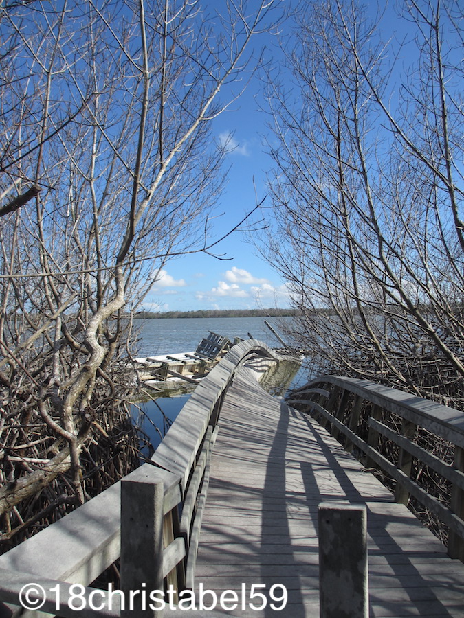 Sonst gibt es in Flamingo leider nicht viel: Hier ist der Einstieg für Kanu-Touren, der Mini-Hafen und das Visitor Center, das nochmal zeigt, welche Schäden die Hurricanes Katharina, Wilma und Irma in den letzten Jahren angerichtet haben. Das war sehr viel, denn dieses Visitor Center wirkte etwas herunter gekommen, wie auch der kleine Hafen und andere Trails, wie der Mangroventrail am West Lake. Der war trocken gelegt, die Aussichtsterrasse war verdreht und verschwand im Wasser. Dennoch sah man, wie langsam Leben in den Wald zurück kommt, denn hier und da gab es neues frisches Grün, die Vögel piepsten und Eidechsen huschten über den Steg, wollten sich mit den roten Socken von Lukas anlegen und machen bedrohliche Liegestützen nach oben und blähen den Hals auf.