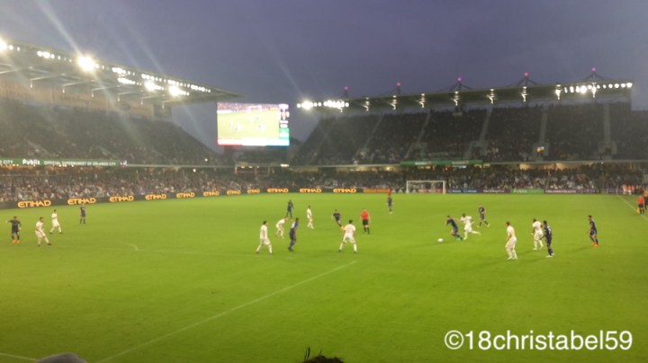 Mein erster Blick auf den Rasen und ich so: Der ist aber klein. Im Fernsehen sah das immer grösser für mich aus. Aber mein Freund versicherte mir, dass der Rasen hier nicht kleiner als in unseren Stadien ist. Ok. Es gab Anfeuerer oder Animateure, fette und viele Fahnen, und laut Lukas war die Stimmung wie bei einem grossen Bundesligaspiel, dabei war das Stadion viel kleiner (25.000) und zu 3/4 gefüllt. Nur so am Rande: Den Verein Orlando City gibt es erst sei 2010 und die spielen erst seit drei Jahren in der MLS… ne? Also alle Achtung an die Fans. Als es anfing, zu regnen, hat das keinem was ausgemacht. Die Fans brüllten verschiedene Lieder in Englisch und Spanisch, es wurde heftig geklatscht, im Takt mitgewackelt, gegen die heruntergeklappten Sitzbänke getreten, um anzufeuern, die Orlando-Spielzüge bejubelt oder gegnerische Aktionen verflucht. Egal, was gerade passierte, es war herrlich. Die Stimmung war ansteckend und hat echt Spass gemacht.