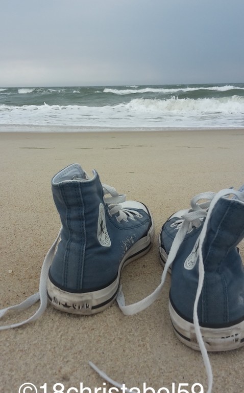 Und dann ging es dem Wind entgegen an den Strand. Sobald meine Schuhe Sand unter den Sohlen hatten, habe ich sie eilig ausgezogen. Denn obwohl die grauen Bauschewolken noch am Himmel waren, war mir das so was von wurscht – ich war am Strand und da gehören die Zehen in den Sand oder ins Wasser. Es tat so gut, endlich wieder Sand unter den Füssen zu spüren, das Meer zu riechen und die Wellen rauschen zu sehen und zu hören.