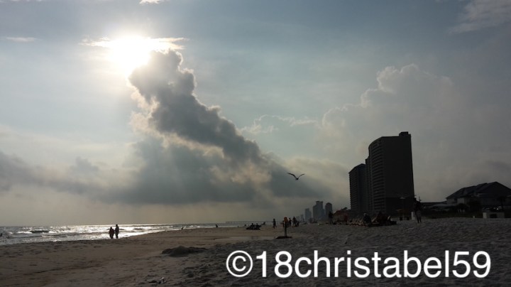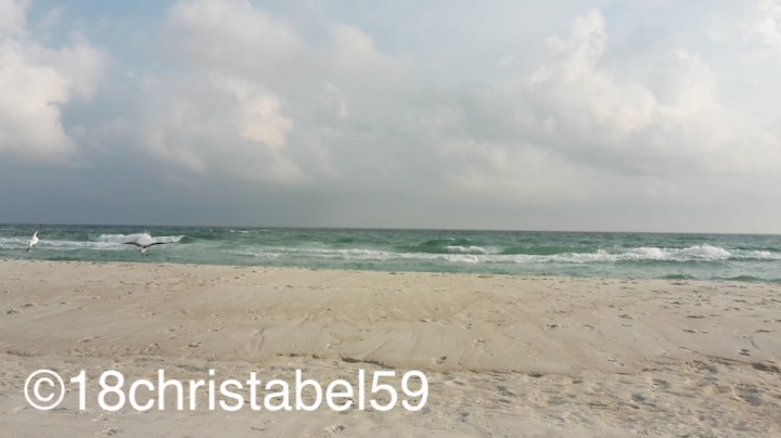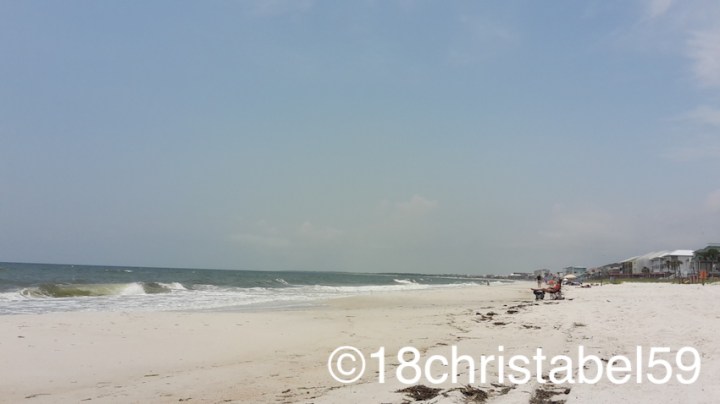 Wir sind dann doch weiter gen Westen gefahren, weg von den dunkleren Wolken, hin zum hell(blauer)en Himmel. In Mexico Beach gab es den zweiten Stopp am Strand, dieses Mal in der Sonne, mit Hinlegen und kurz ins Meer gehen, um sich von den Wellen patschnass machen zu lassen. Aber Leuts, das war vielleicht ein wunderschöner, schneeweisser, feiner Sandstrand. So weiss, dass man die Augen zusammenkneifen musste, damit man was sehen kann, oder halt die Sonnenbrille aufsetzen musste. Zusammen mit dem dunkelblauen Meer und dem hellblauen Himmel war das ein traumhaft schönes Bild. Die Sonne brannte, der Wind wehte, wir dösten einfach vor uns hin, der eine schlafend, die andere lesend. Im Hinterland türmten sich immer höhere Bauschewolken auf, die nach einem Gewitter aussahen. Aber zu unserem Glück kam der Wind vom Meer, so dass wir wunderbare 2,5 Stunden in der Sonne chillen konnten.