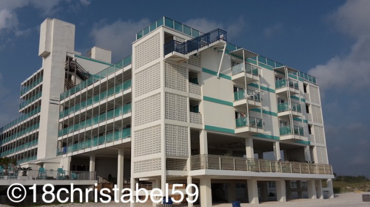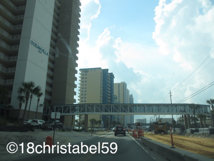 Dann ging es durch Grünstrecken mit Kiefernwäldern und Sumpf sowie den Freitagnachmittagsverkehr nach Panama City Beach, vorbei an einem elend riesigen Air Force Gelände, bei dem ich mich gefragt habe, ob das so was wie die Area 51 ist. Denn man hat keine Menschen gesehen, nur leer stehende Fahrzeuge… Egal. Panama City ist nicht wirklich schön, Industrie und viel Verkehr. Panama City Beach ist auch nicht viel schöner, denn hier türmt sich ein Hotelplattenbau nach dem anderen in die Höhe. Und ich meine wirklich „türmen“, ich hab selten so hohe oder fette Hotelhochhäuser gesehen. Die Front Beach Road ist so was wie der Strip – auf der einen Seite Meer, Strand, fette Hotelbunker, auf der anderen Seite Kneipen, Lokale, Fast-Food-Ketten, kleine Ramschläden, Minigolf- oder andere Unterhaltungsanlagen und eine Baustelle.