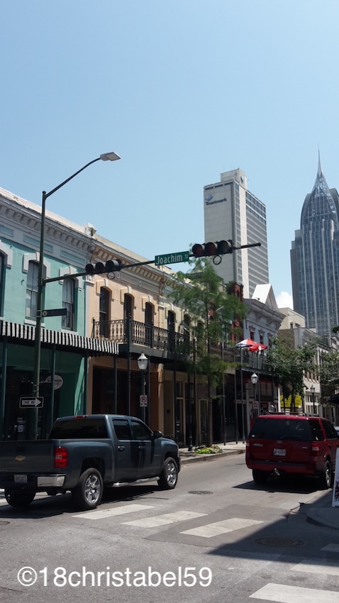 Nach dem Auschecken und vor unserer Weiterfahrt gen Westen waren wir noch kurz in Downtown Mobile. Gut, es war Sonntag Mittag, scheisse heiss und deswegen war so gut wie nichts los, idyllisch-friedliche Sonntagsruhe. Wir sind die Dauphin Street runter, die süsse Hauptstrasse mit Kneipen, Cafés und gusseisernen Balkonen, wo Abends halt der Bär steppt.