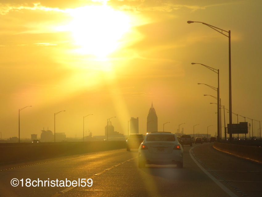 Nach unserem kurzen Stopp in Pensacola sind wir am Abend noch in Mobile, Alabama, angekommen. Die Anfahrt vom Osten her ist schon beeindruckend, vor allem bei Sonnenuntergang. Erst sind wir über eine lange Brücke über die Mobile Bay gen Stadt gefahren, die Sonne ging langsam unter und am orangefarbenen Horizont zeichnete sich die Skyline ab, mit dem Hafen links davon.