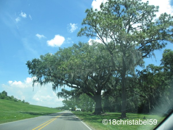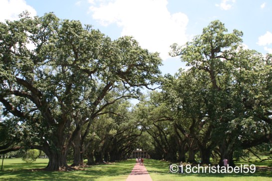 Das ist die wohl bekannteste Plantage, die man besichtigen kann, aber auch die vollste, und die Touristen versammeln sich schon auf dem Parkplatz. Gescheite Fotos kann man erst machen, wenn man den Eintritt gezahlt hat. Da wir aber noch eine andere Plantage auf dem Plan hatten, gab es hier nur einen kurzen Pipistop. Aber hinter dem Klohäuschen sieht man schon die ersten riesigen Eichenbäume, die sich wohl seit Jahrhunderten dort ausbreiten. Die sind schon atemberaubend. Und man sieht die Allee, die zum Plantagenhaus führt – von der Seite. Quasi grosse schöne Bäume und keine Sicht aufs Haus. Jedenfalls nicht von da. Hihi.
