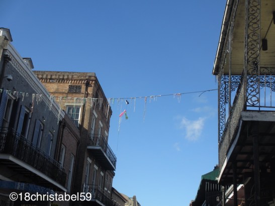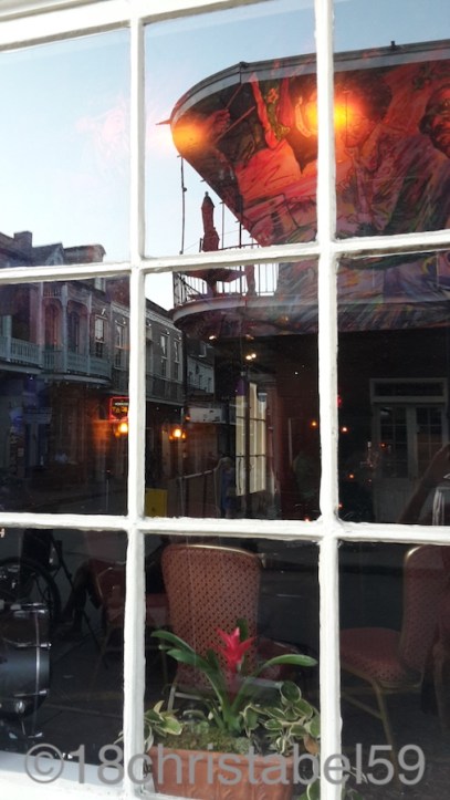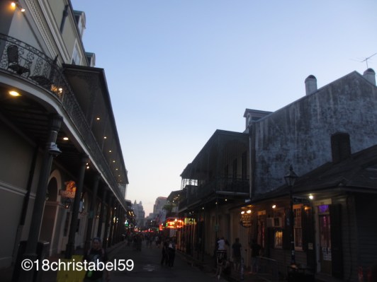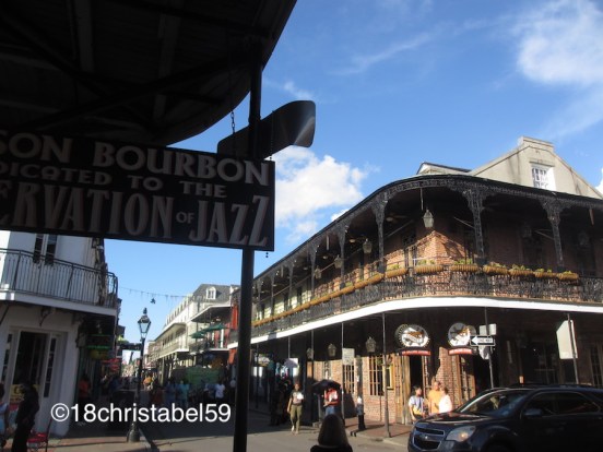 Aber je näher wir ins Zentrum gekommen sind, also hinter den Jackson Square, desto mehr haben wir gemerkt, dass das French Quarter ein sehr belebtes Viertel ist, vor allem um die berüchtigte Bourbon Street. Hier reihen sich eine Bar, Kneipe, Restaurant und Touri-Laden nach dem anderen aneinander, es ist für jede Preisklasse dabei. Diese Bourbon Street ist die Partymeile und im Februar Karnevalsmeile, da marschieren am Mardi Gras die Umzüge lang, von den Fenstern und Balkonen jubeln und feiern Partypeople und verteilen bunte metallene Perlenketten an die Mädels (was in Kölle s Bützche is, is hier die Perlenkette, wenn ihr wisst, was ich meine).