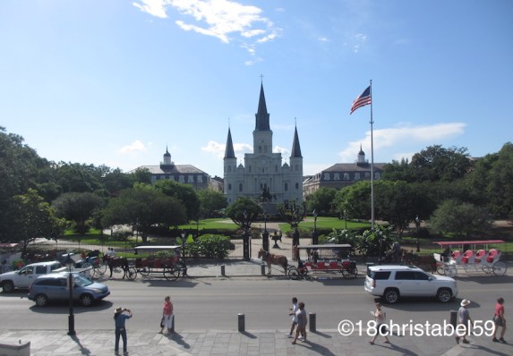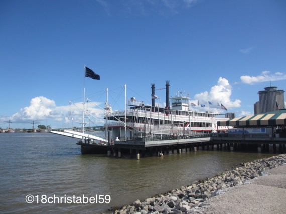 Zwischen all den alten Bauten gab die Bourbon Street und ihre Seitenstrassen gen Westen teils den kontrastreichem Blick auf die gläsernen und metallartigen Wolkenkratzer des Bankenviertels frei. Fand ich voll super. Als wir so durch die Strassen vom French Quarter tüdelten, sind wir im Süden neben dem French Market rausgekommen, wo man an allerlei Geschäfte vorbei bummeln kann. Etwas weiter endet das Viertel, weil da der Fluss kommt. Aber das heisst nicht, dass es nichts mehr zu sehen gibt, im Gegenteil. Wir sind auf dem Moon Walk gelandet, einem Damm mit Fussweg und Aussicht: Zur einen Seite liegt der majestätische Mississippi mit den typischen Schaufelraddampfern und auf der anderen Seite, hinter den Gleisen baut sich das French Quarter auf, mit dem Jackson Square und der St. Louis Church im Mittelpunkt. Postkartenfotoalarm – egal ob tagsüber oder im Sonnenuntergang. Im Licht der untergehenden Sonne bekommt das French Quarter einen goldrosaorangefarbenen Schimmer und strahlt in einem besonderen Charme.