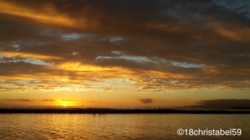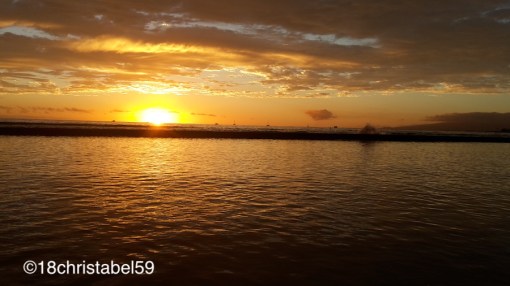 Da wir ja auf Hawaii näher am Äquator sind, geht das Spektakel „Sonnenuntergang“ keine 15 min. Zack, bums, aus Feierabend. Wenn die Sonne sich hinter dem Horizont verabschiedet hat, kommt die Dunkelheit der Nacht recht schnell. Es bleibt ein immer schwächer werdender orange-rosa-goldener Schimmer, der irgendwann schwarz wird. Ah, ich könnt mich dran gewöhnen….